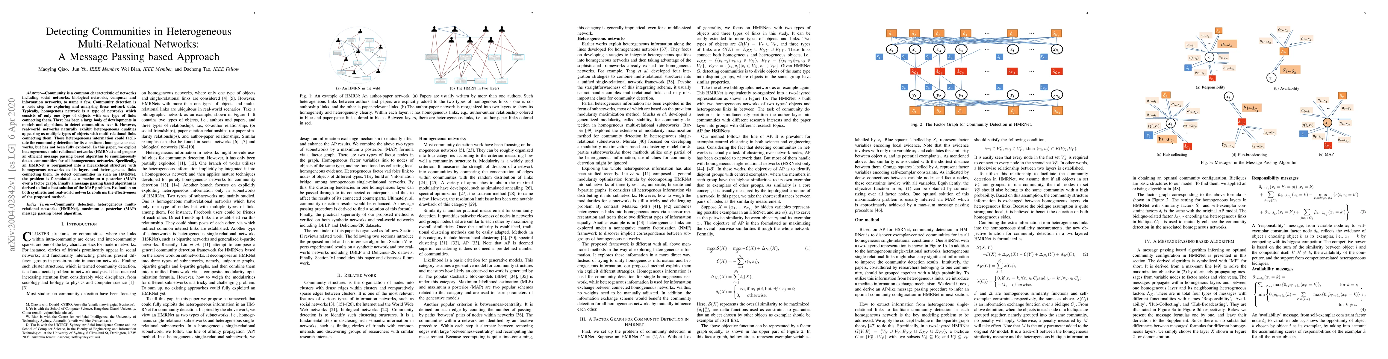 This paper proposes a message passing based algorithm to detect communities in heterogeneous multi-relational networks (HMRNet), where multiple types of objects and links exist. The method reorganizes HMRNet into a hierarchical structure and formulates community detection as a maximum a posterior (MAP) problem, achieving effective community detection through evaluation on synthetic and real-world datasets.