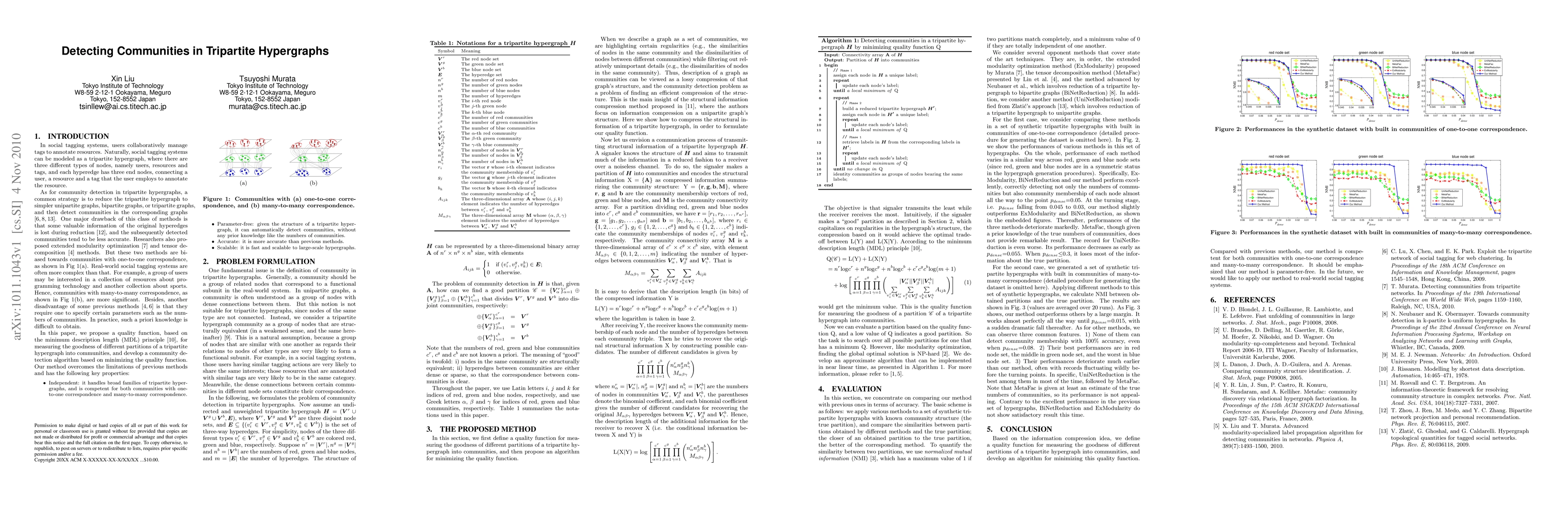 In social tagging systems, also known as folksonomies, users collaboratively manage tags to annotate resources. Naturally, social tagging systems can be modeled as a tripartite hypergraph, where there are three different types of nodes, namely users, resources and tags, and each hyperedge has three end nodes, connecting a user, a resource and a tag that the user employs to annotate the resource. Then, how can we automatically detect user, resource and tag communities from the tripartite hypergraph? In this paper, by turning the problem into a problem of finding an efficient compression of the hypergraph's structure, we propose a quality function for measuring the goodness of partitions of a tripartite hypergraph into communities. Later, we develop a fast community detection algorithm based on minimizing the quality function. We explain advantages of our method and validate it by comparing with various state of the art techniques in a set of synthetic datasets.