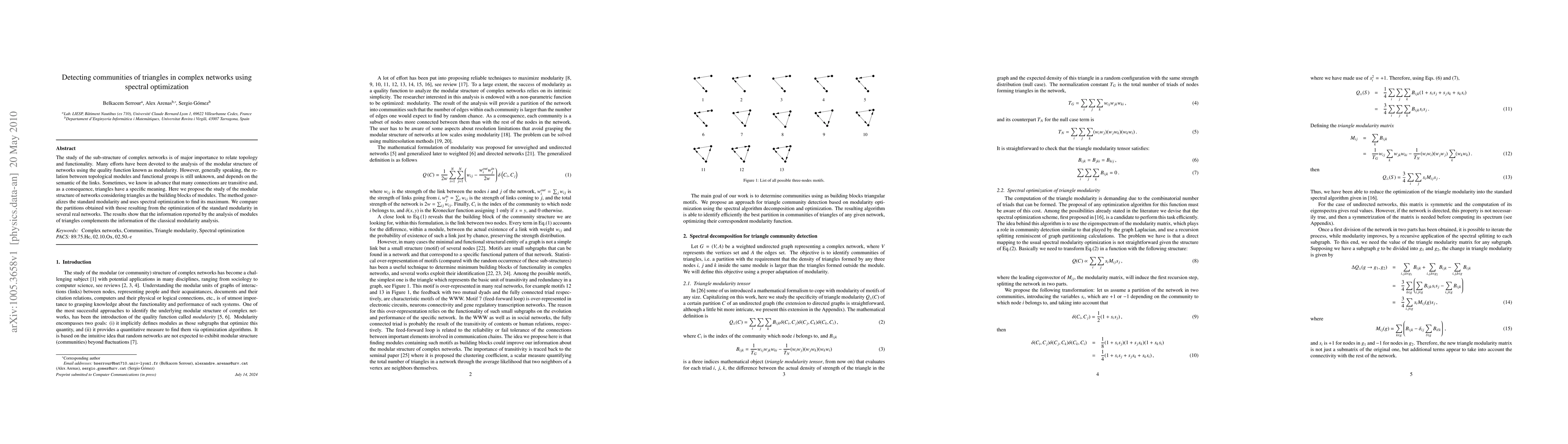 This paper proposes a method to detect communities of triangles in complex networks using spectral optimization, generalizing the standard modularity approach to better understand the relationship between network topology and functionality. The results indicate that analyzing triangle-based modules provides complementary insights compared to traditional modularity analysis.
