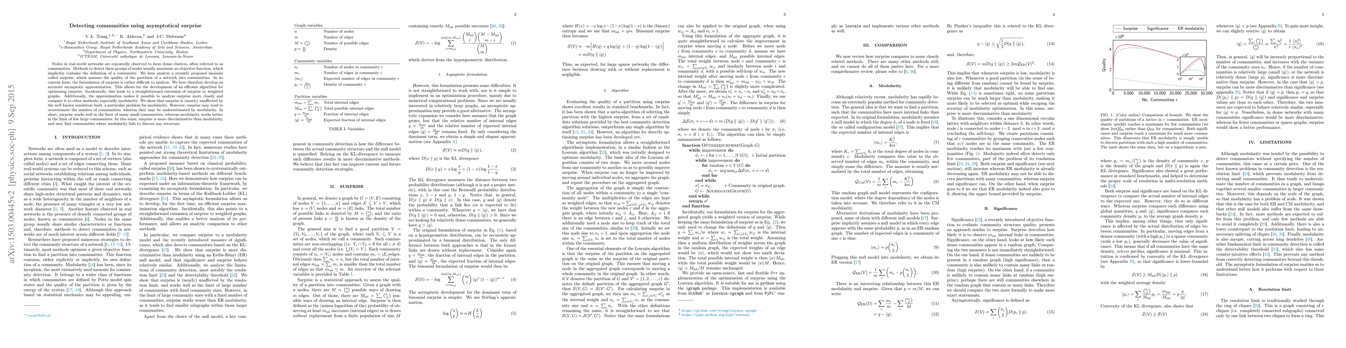 This paper proposes an asymptotic approximation of the surprise measure for detecting communities in networks, enabling an efficient algorithm and extending its application to weighted graphs. Unlike modularity, surprise is less affected by the resolution limit and can better detect many small communities, though it may overestimate their number.