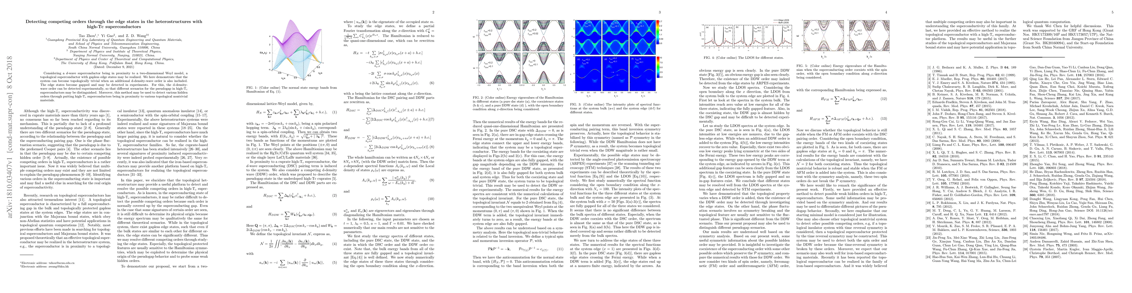 Considering a $d$-wave superconductor being in proximity to a two-dimensional Weyl model, a topological superconductor with gapless edge states may be realized. We here demonstrate that the system can become topologically trivial when an additional d-density-wave order is also included. The edge states become gapped and may be detected in experiments. For this, the d-density-wave order can be detected experimentally, so that different scenarios for the pseudogap in high-T$_c$ superconductors may be distinguished. Moreover, this method may be used to detect various hidden orders through putting high-T$_c$ superconductors being in proximity to various topological nontrivial materials.