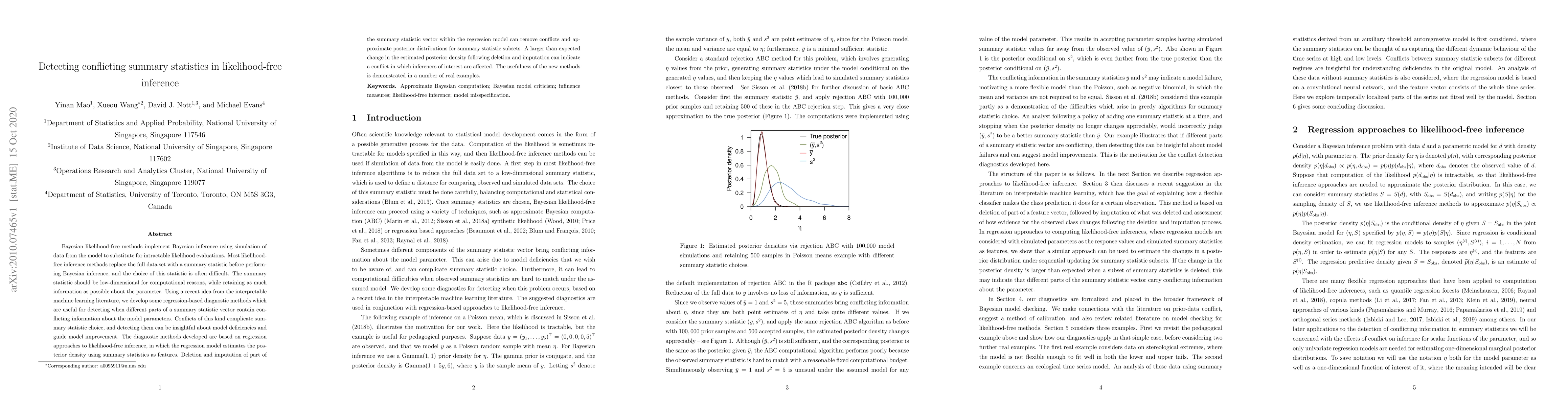 Researchers developed diagnostic methods to detect conflicts in summary statistics used in likelihood-free inference, which can inform model improvement and guide data collection strategies.