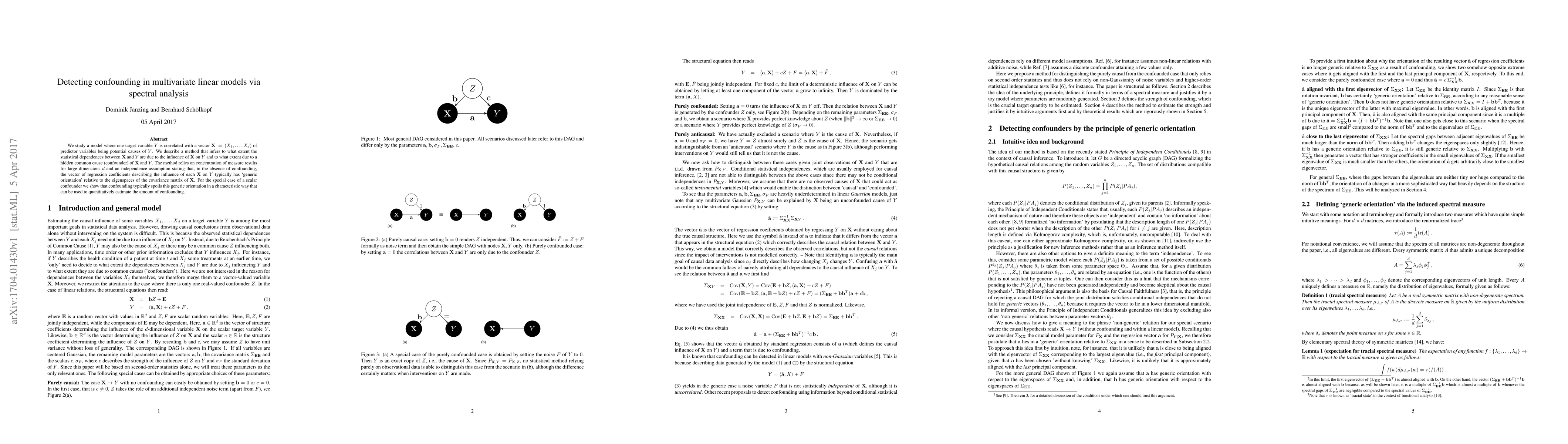 This research introduces a method to detect confounding in multivariate linear models using spectral analysis. It leverages concentration of measure results for high-dimensional data and an independence assumption to quantify the impact of confounding on the regression coefficients' orientation relative to X's eigenspaces.