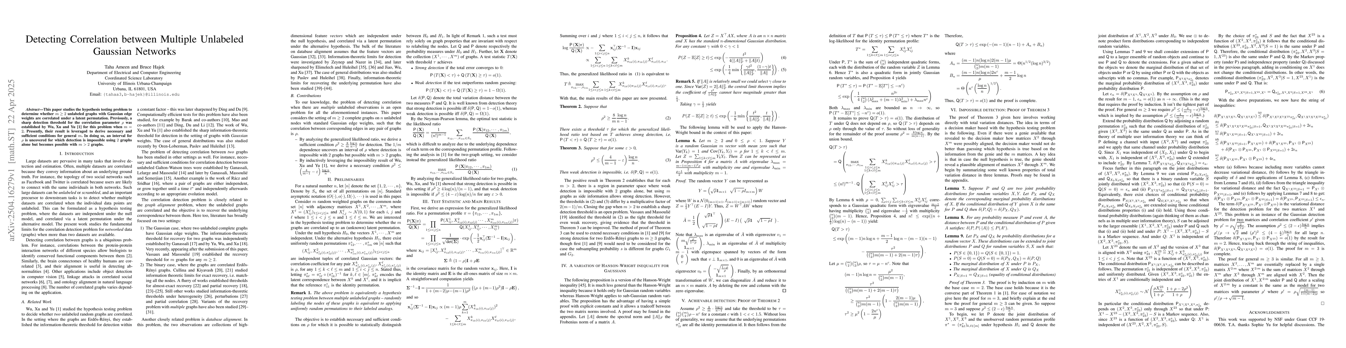The paper analyzes the hypothesis testing problem for m > 2 unlabeled Gaussian networks to determine if they are correlated under a latent permutation, extending previous results for m = 2 by Wu, Xu, and Yu.