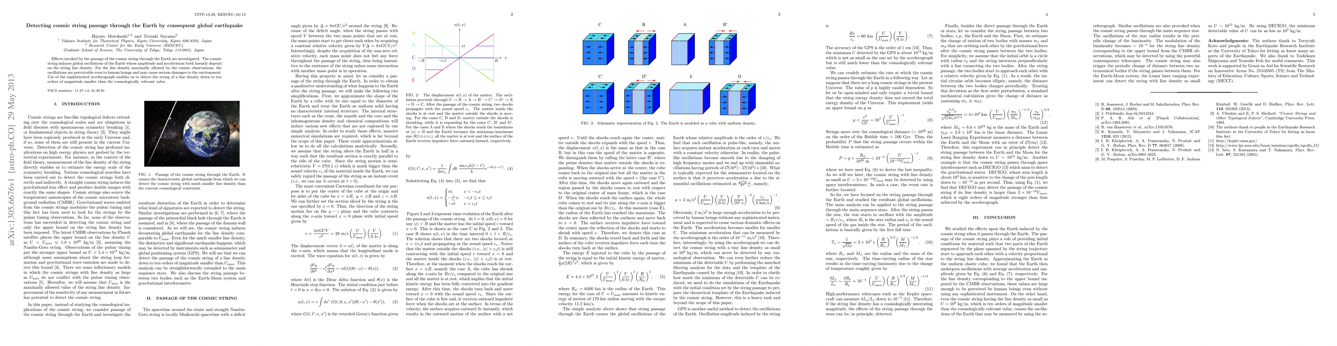 Effects invoked by the passage of the cosmic string through the Earth are investigated. The cosmic string induces global oscillations of the Earth whose amplitude and acceleration both linearly depend on the string line density. For the line density maximally allowed by the cosmic observations, the oscillations are perceivable even to human beings and may cause serious damages to the environment. Use of the sophisticated accelerograph enables us to detect the string of a line density down to ten orders of magnitude smaller than the cosmologically relevant value.
