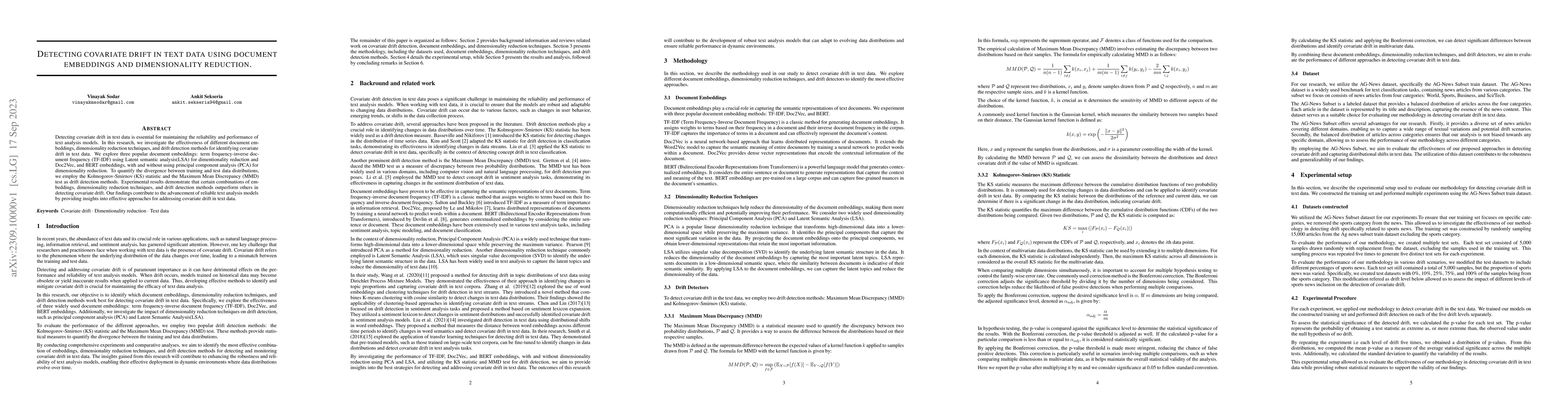 This research evaluates various document embeddings and dimensionality reduction methods to detect covariate drift in text data, employing TF-IDF, Doc2Vec, and BERT embeddings with LSA and PCA, and using KS statistic and MMD test for drift detection. Results show specific combinations are more effective for identifying drift, aiding in the development of reliable text analysis models.