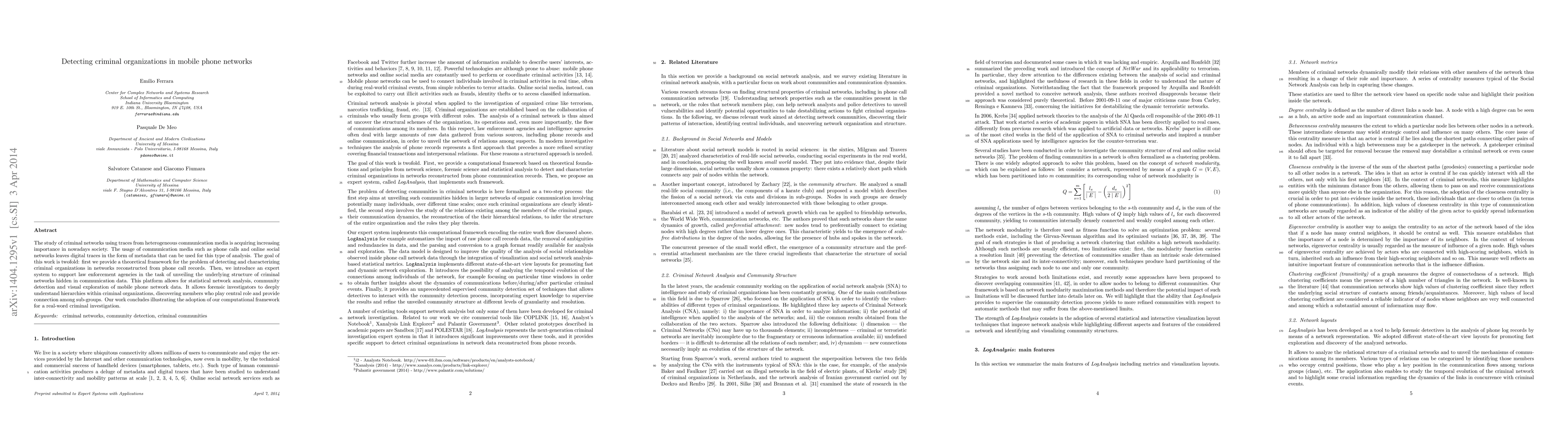 This paper develops a theoretical framework and an expert system for detecting and characterizing criminal organizations using mobile phone call metadata. It provides tools for statistical network analysis, community detection, and visual exploration to help law enforcement uncover hidden structures within criminal networks.