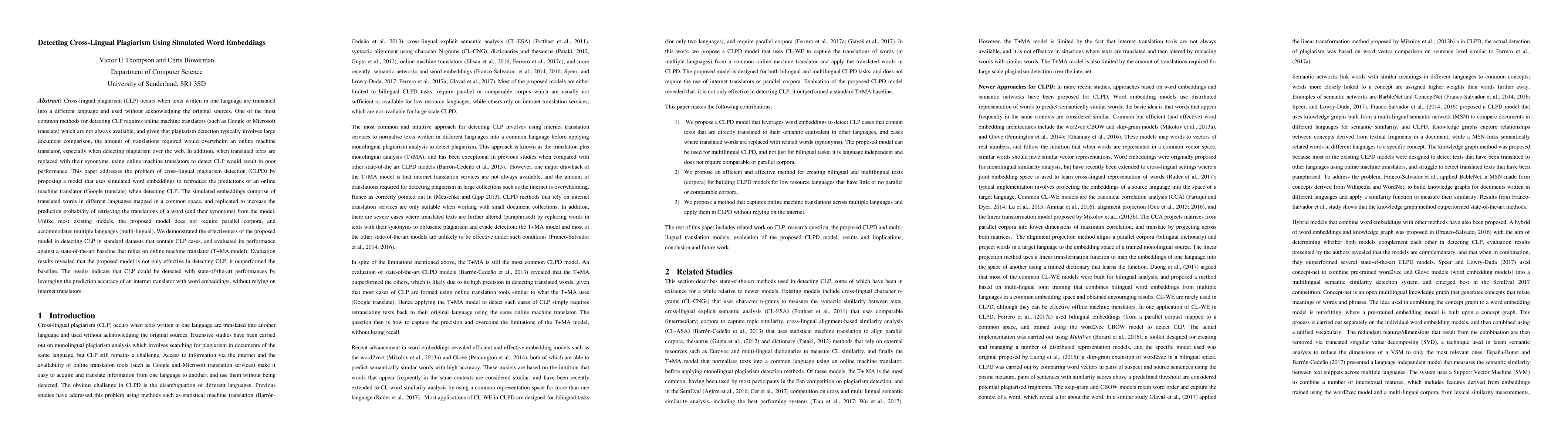 Cross-lingual plagiarism (CLP) occurs when texts written in one language are translated into a different language and used without acknowledging the original sources. One of the most common methods for detecting CLP requires online machine translators (such as Google or Microsoft translate) which are not always available, and given that plagiarism detection typically involves large document comparison, the amount of translations required would overwhelm an online machine translator, especially when detecting plagiarism over the web. In addition, when translated texts are replaced with their synonyms, using online machine translators to detect CLP would result in poor performance. This paper addresses the problem of cross-lingual plagiarism detection (CLPD) by proposing a model that uses simulated word embeddings to reproduce the predictions of an online machine translator (Google translate) when detecting CLP. The simulated embeddings comprise of translated words in different languages mapped in a common space, and replicated to increase the prediction probability of retrieving the translations of a word (and their synonyms) from the model. Unlike most existing models, the proposed model does not require parallel corpora, and accommodates multiple languages (multi-lingual). We demonstrated the effectiveness of the proposed model in detecting CLP in standard datasets that contain CLP cases, and evaluated its performance against a state-of-the-art baseline that relies on online machine translator (T+MA model). Evaluation results revealed that the proposed model is not only effective in detecting CLP, it outperformed the baseline. The results indicate that CLP could be detected with state-of-the-art performances by leveraging the prediction accuracy of an internet translator with word embeddings, without relying on internet translators.
