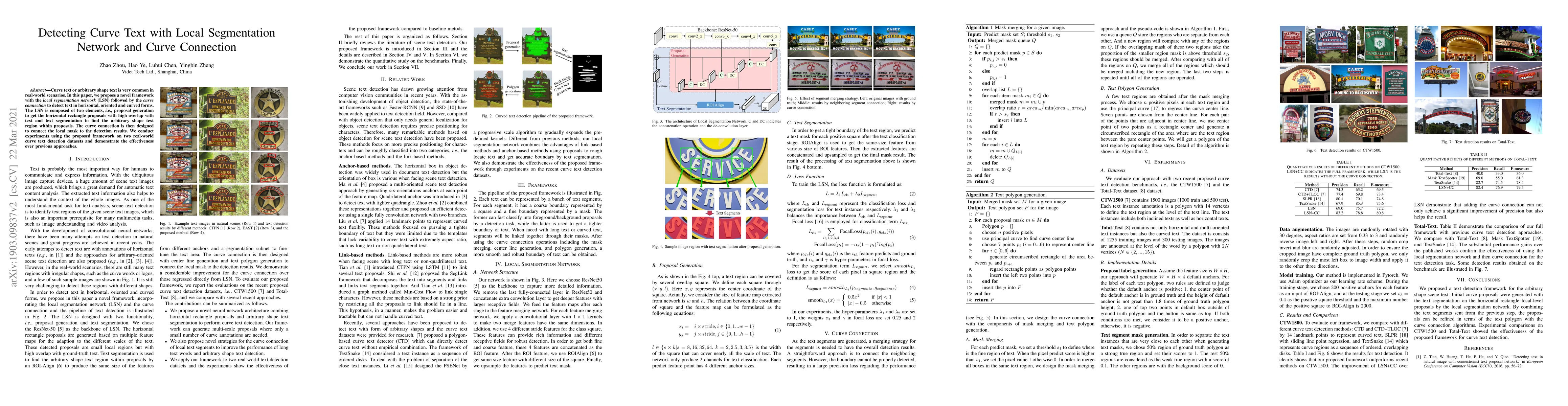A new framework combines local segmentation networks with curve connection to detect text in various forms (horizontal, oriented, curved) on real-world datasets, outperforming previous approaches.
