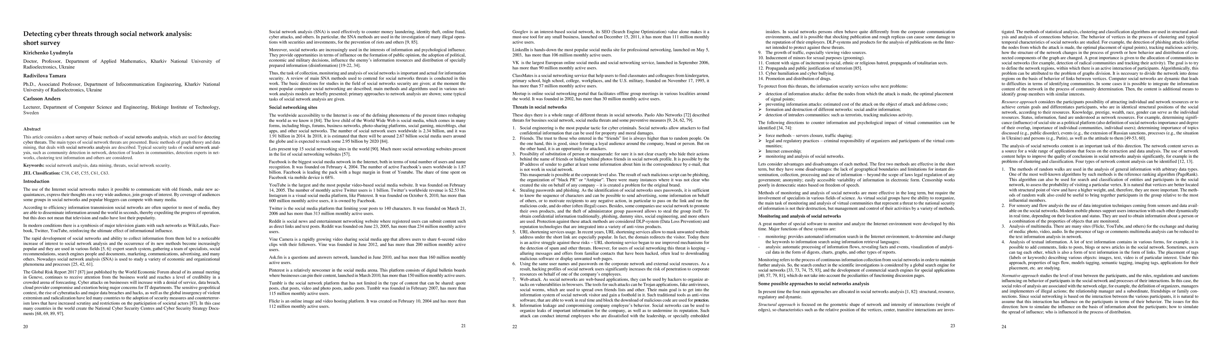 This article considers a short survey of basic methods of social networks analysis, which are used for detecting cyber threats. The main types of social network threats are presented. Basic methods of graph theory and data mining, that deals with social networks analysis are described. Typical security tasks of social network analysis, such as community detection in network, detection of leaders in communities, detection experts in networks, clustering text information and others are considered.