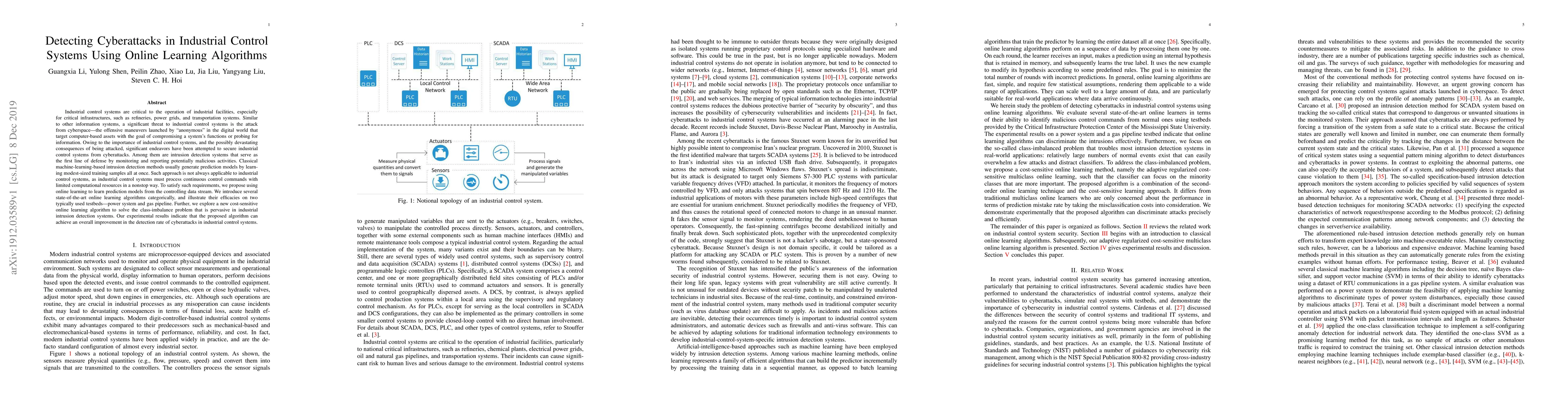 This paper proposes using online learning algorithms to detect cyberattacks in industrial control systems, addressing the limitations of classical machine learning methods. It introduces several online learning algorithms and evaluates their performance on power systems and gas pipelines, demonstrating the effectiveness of a new cost-sensitive online learning algorithm in improving detection rates for class-imbalance issues.