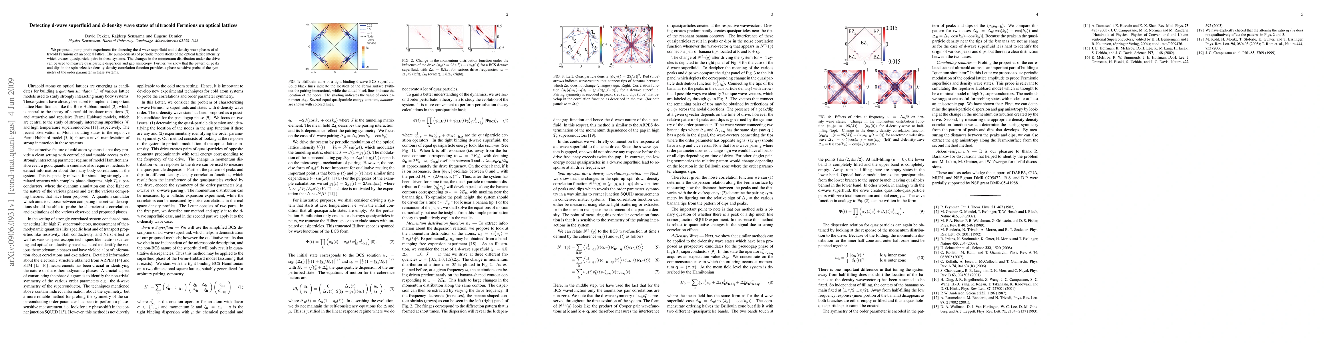 We propose a pump probe experiment for detecting the d-wave superfluid and d-density wave phases of ultracold Fermions on an optical lattice. The pump consists of periodic modulations of the optical lattice intensity which creates quasiparticle pairs in these systems. The changes in the momentum distribution under the drive can be used to measure quasiparticle dispersion and gap anisotropy. Further, we show that the pattern of peaks and dips in the spin selective density-density correlation function provides a phase sensitive probe of the symmetry of the order parameter in these systems.