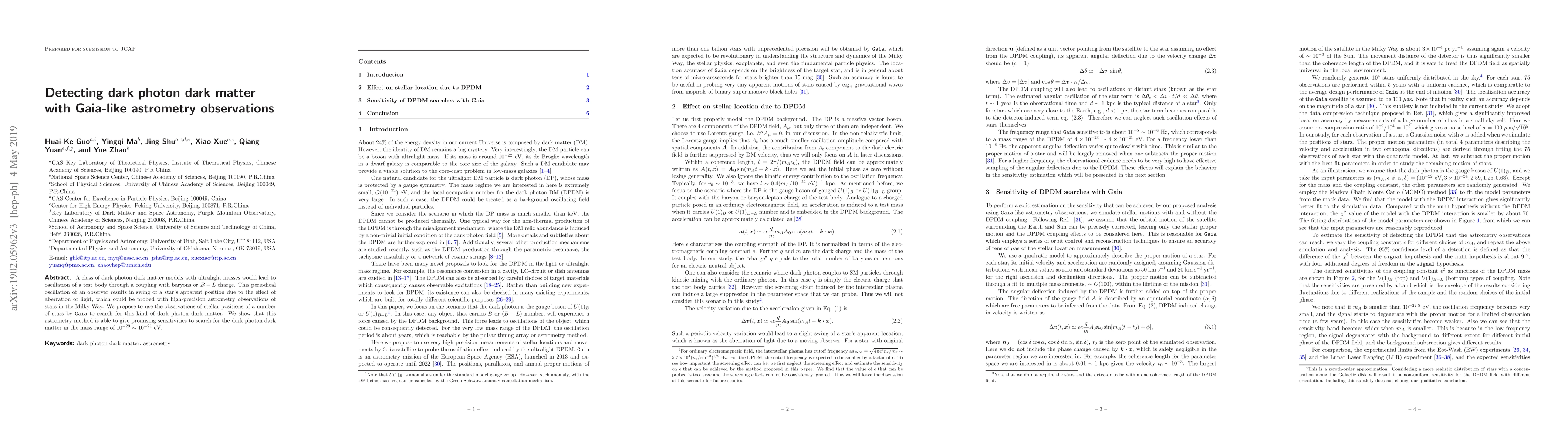 This paper proposes using high-precision astrometry observations from Gaia-like missions to detect dark photon dark matter through the periodic oscillation of stars' apparent positions caused by the coupling effect. The method shows promising sensitivity in detecting dark photon dark matter in the mass range of $10^{-23}\sim10^{-21}$ eV.