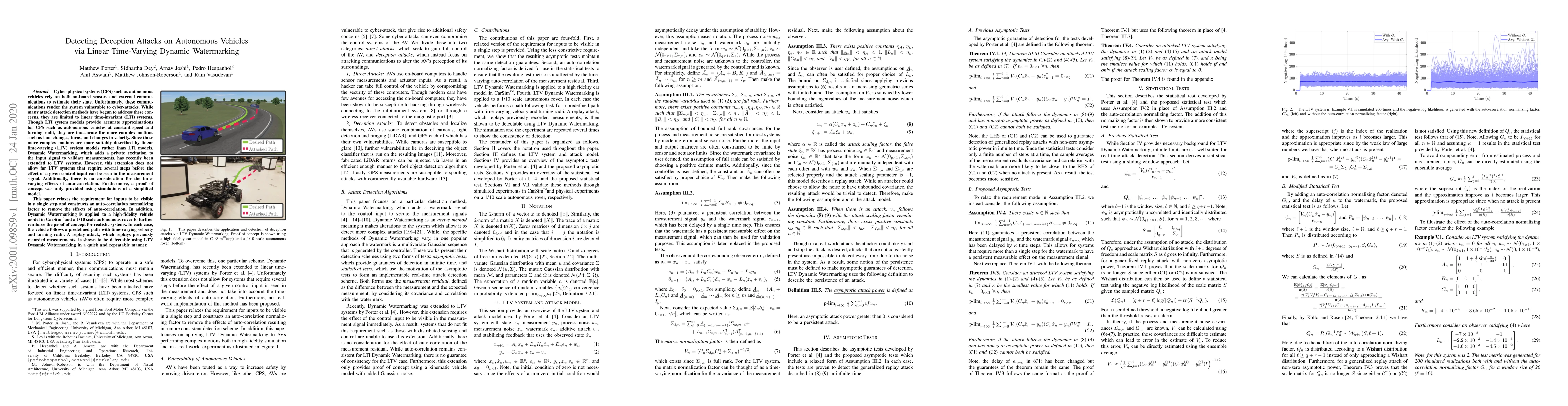 Cyber-physical systems (CPS) such as autonomous vehicles rely on both on-board sensors and external communications to estimate their state. Unfortunately, these communications render the system vulnerable to cyber-attacks. While many attack detection methods have begun to address these concerns, they are limited to linear time-invariant (LTI) systems. Though LTI system models provide accurate approximations for CPS such as autonomous vehicles at constant speed and turning radii, they are inaccurate for more complex motions such as lane changes, turns, and changes in velocity. Since these more complex motions are more suitably described by linear time-varying (LTV) system models rather than LTI models, Dynamic Watermarking, which adds a private excitation to the input signal to validate measurements, has recently been extended to LTV systems. However, this extension does not allow for LTV systems that require several steps before the effect of a given control input can be seen in the measurement signal. Additionally, there is no consideration for the time-varying effects of auto-correlation. Furthermore, a proof of concept was only provided using simulations of a simplified model. This paper relaxes the requirement for inputs to be visible in a single step and constructs an auto-correlation normalizing factor to remove the effects of auto-correlation. In addition, Dynamic Watermarking is applied to a high-fidelity vehicle model in carsim and a 1/10 scale autonomous rover to further reinforce the proof of concept for realistic systems. In each case, the vehicle follows a predefined path with time-varying velocity and turning radii. A replay attack, which replays previously recorded measurements, is shown to be detectable using LTV Dynamic Watermarking in a quick and repeatable manner.
