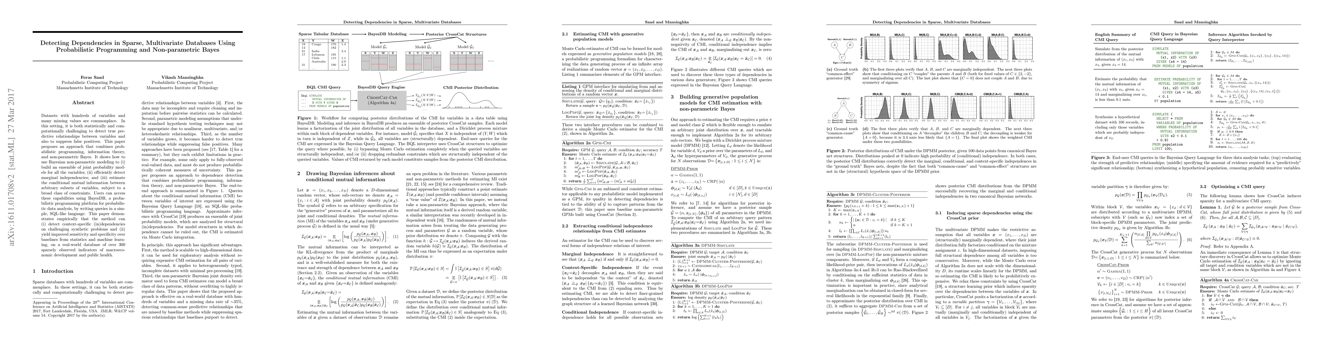 Datasets with hundreds of variables and many missing values are commonplace. In this setting, it is both statistically and computationally challenging to detect true predictive relationships between variables and also to suppress false positives. This paper proposes an approach that combines probabilistic programming, information theory, and non-parametric Bayes. It shows how to use Bayesian non-parametric modeling to (i) build an ensemble of joint probability models for all the variables; (ii) efficiently detect marginal independencies; and (iii) estimate the conditional mutual information between arbitrary subsets of variables, subject to a broad class of constraints. Users can access these capabilities using BayesDB, a probabilistic programming platform for probabilistic data analysis, by writing queries in a simple, SQL-like language. This paper demonstrates empirically that the method can (i) detect context-specific (in)dependencies on challenging synthetic problems and (ii) yield improved sensitivity and specificity over baselines from statistics and machine learning, on a real-world database of over 300 sparsely observed indicators of macroeconomic development and public health.