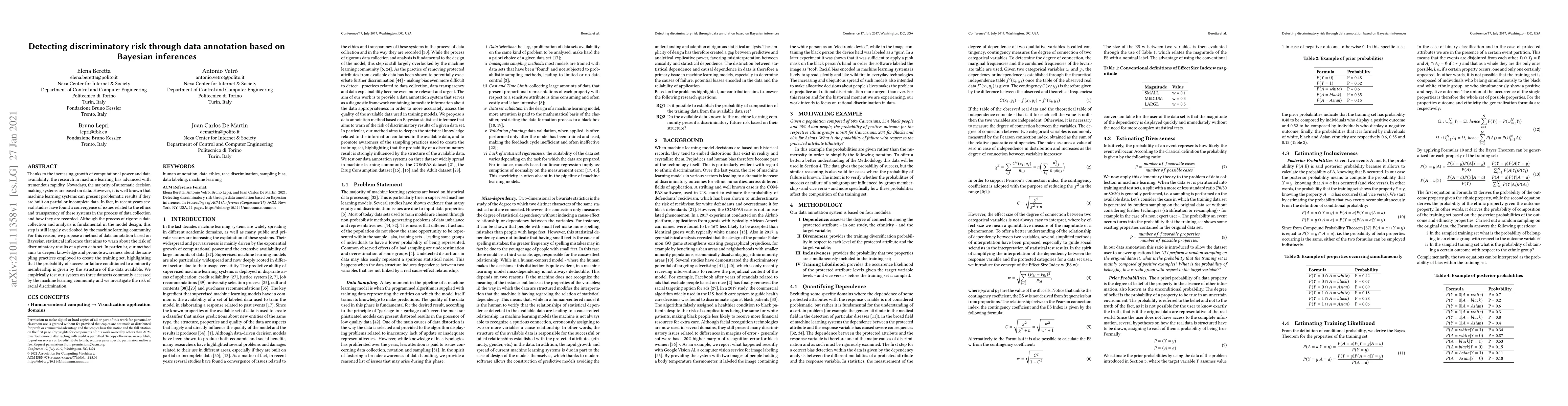 Thanks to the increasing growth of computational power and data availability, the research in machine learning has advanced with tremendous rapidity. Nowadays, the majority of automatic decision making systems are based on data. However, it is well known that machine learning systems can present problematic results if they are built on partial or incomplete data. In fact, in recent years several studies have found a convergence of issues related to the ethics and transparency of these systems in the process of data collection and how they are recorded. Although the process of rigorous data collection and analysis is fundamental in the model design, this step is still largely overlooked by the machine learning community. For this reason, we propose a method of data annotation based on Bayesian statistical inference that aims to warn about the risk of discriminatory results of a given data set. In particular, our method aims to deepen knowledge and promote awareness about the sampling practices employed to create the training set, highlighting that the probability of success or failure conditioned to a minority membership is given by the structure of the data available. We empirically test our system on three datasets commonly accessed by the machine learning community and we investigate the risk of racial discrimination.