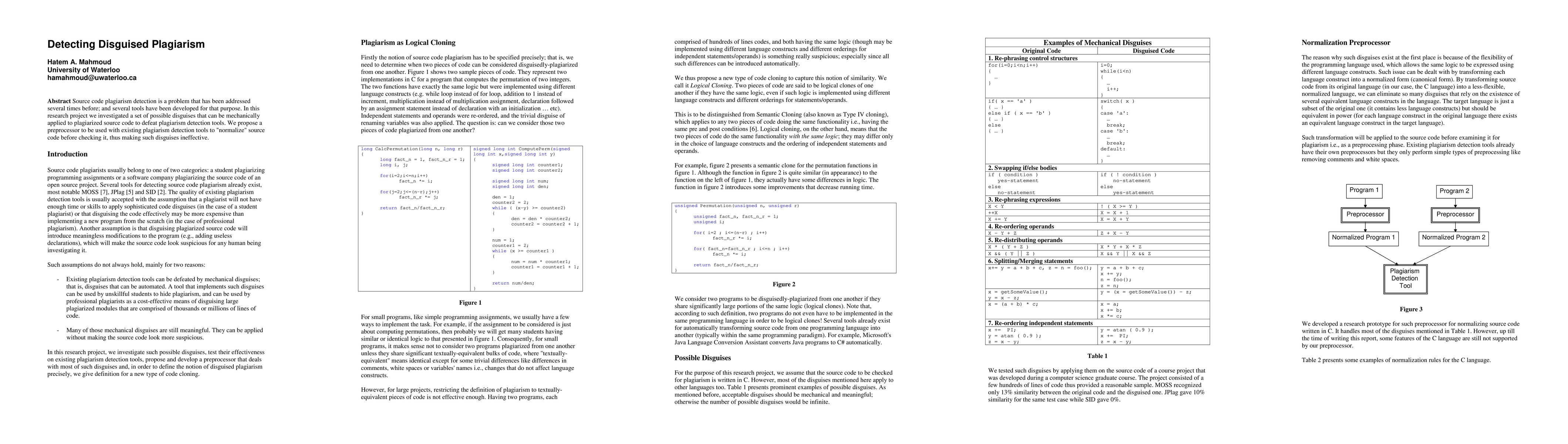 This research investigates methods to disguise plagiarism in source code to evade detection tools, proposing a preprocessor to normalize code and enhance the effectiveness of existing plagiarism detection systems.