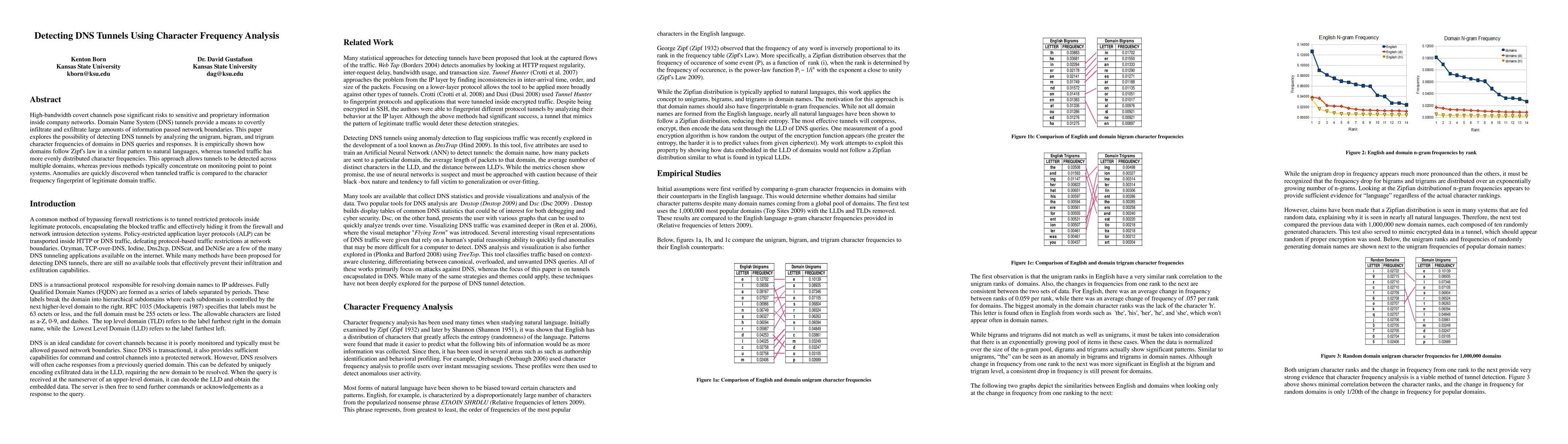 This paper proposes a method to detect DNS tunnels by analyzing character frequency distributions in DNS queries and responses, showing that tunneled traffic has more uniform character frequencies compared to legitimate traffic, which follows Zipf's law. This approach enables the detection of DNS tunnels across multiple domains, identifying anomalies effectively.
