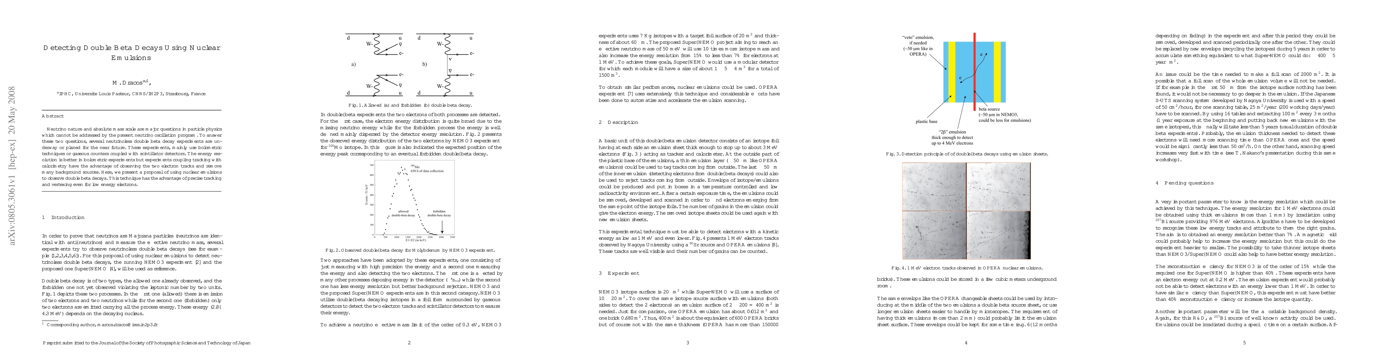 Neutrino nature and absolute mass scale are major questions in particle physics which cannot be addressed by the present neutrino oscillation program. To answer these two questions, several neutrinoless double beta decay experiments are underway or planed for the near future. These experiments, mainly use bolometric techniques or gaseous counters coupled with scintillator detectors. The energy resolution is better in bolometric experiments but experiments coupling tracking with calorimetry have the advantage of observing the two electron tracks and remove many background sources. Here, we present a proposal of using nuclear emulsions to observe double beta decays. This technique has the advantage of precise tracking and vertexing even for low energy electrons.