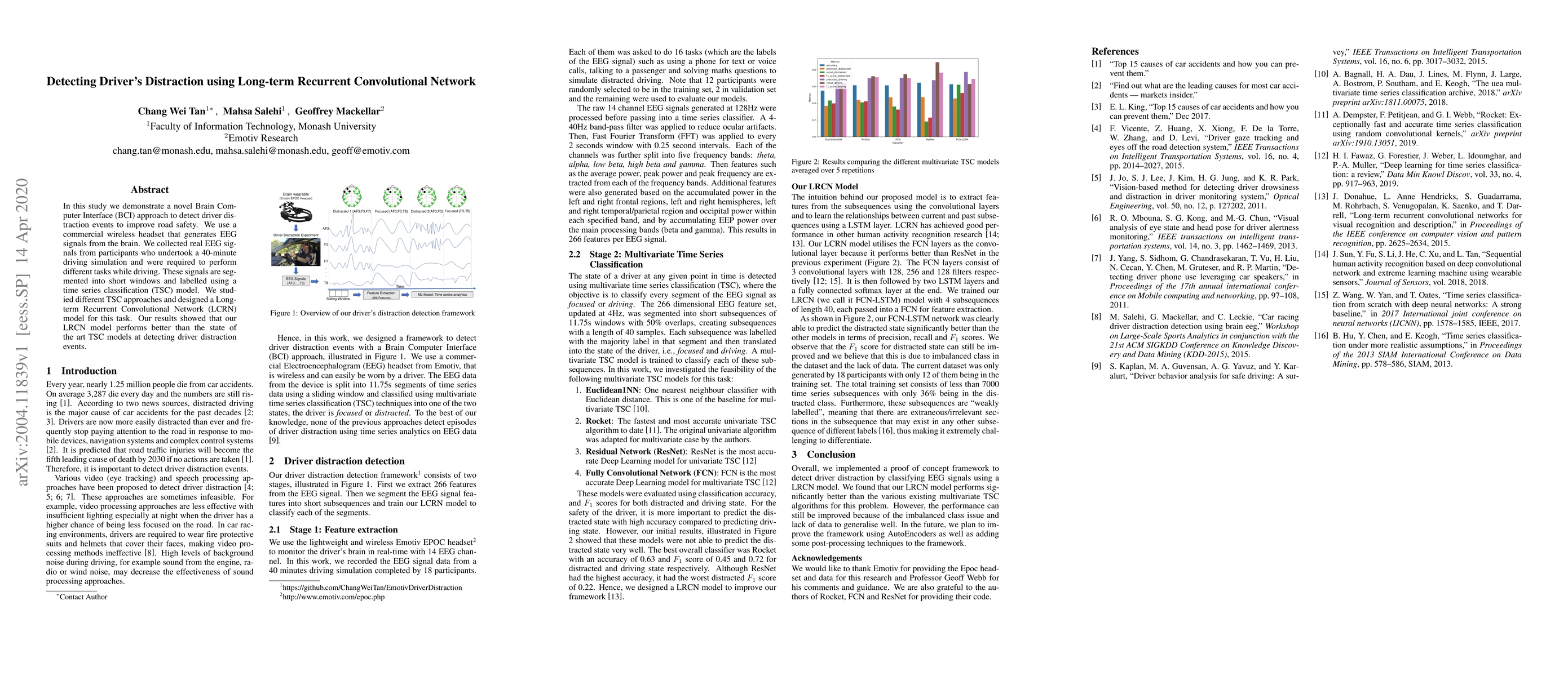 This study introduces a novel Brain Computer Interface (BCI) method using a Long-term Recurrent Convolutional Network (LRCN) to detect driver distraction during a 40-minute driving simulation. The LRCN model outperforms existing time series classification models in identifying distraction events from EEG signals.
