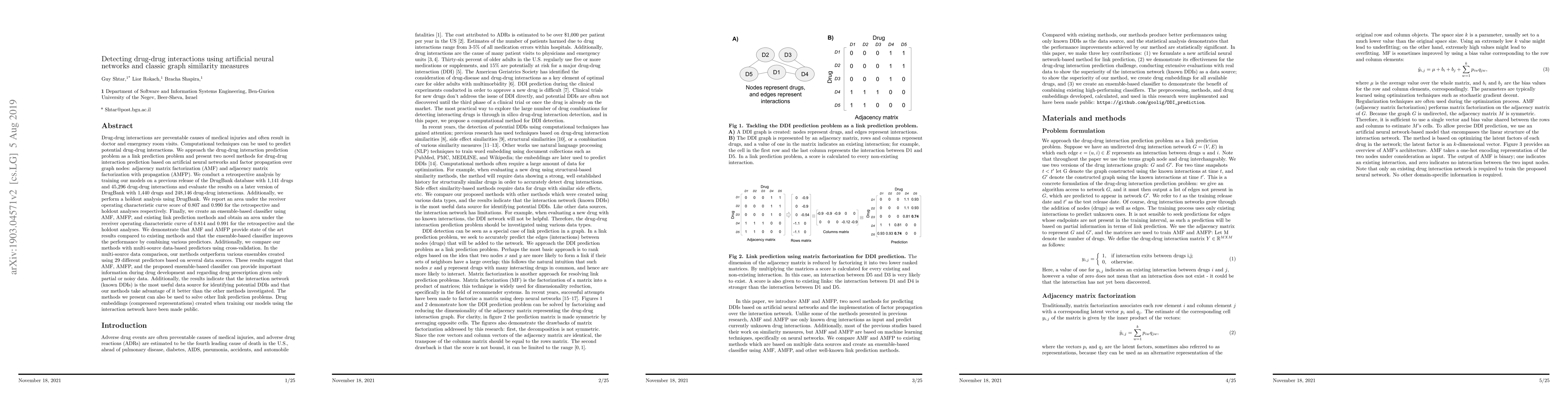 This paper proposes novel methods, adjacency matrix factorization (AMF) and AMF with propagation (AMFP), for predicting drug-drug interactions using artificial neural networks and graph similarity measures. The ensemble-based classifier combining these methods achieves state-of-the-art performance, suggesting their utility in drug development and prescription.