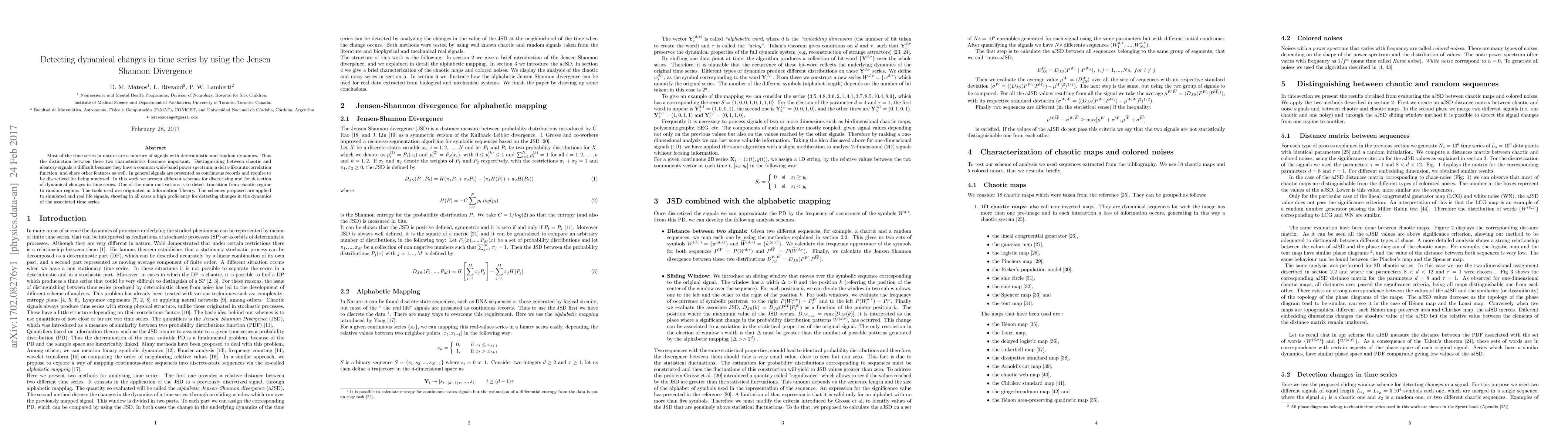 This paper proposes a method to detect changes in time series using Jensen-Shannon divergence, identifying transitions between chaotic and random dynamics. The approach shows high proficiency in detecting dynamical changes in both simulated and real-life signals.