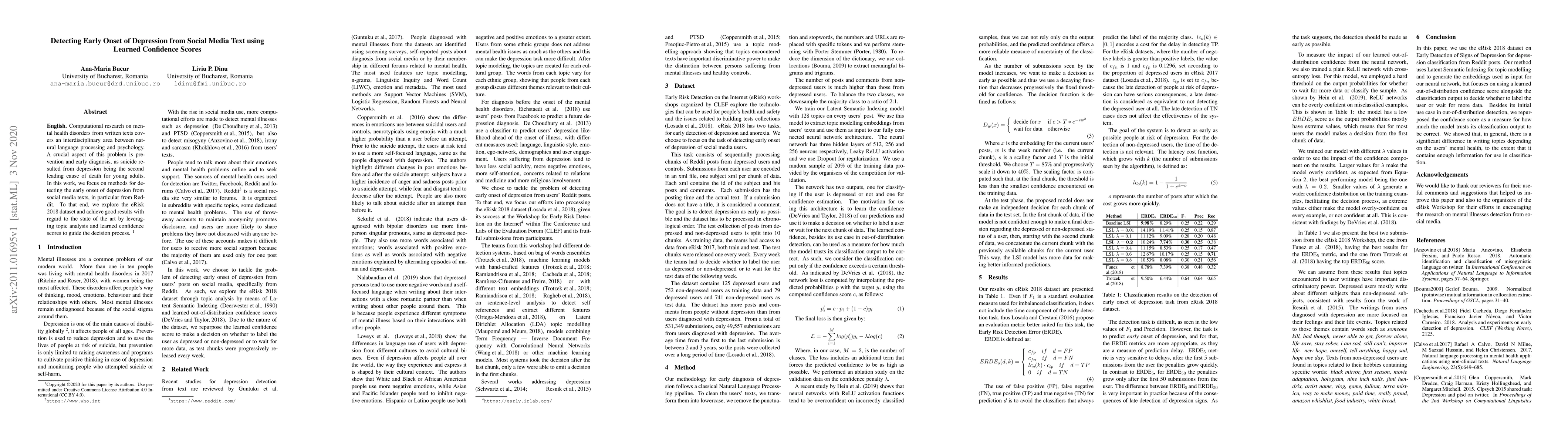 Computational research on mental health disorders from written texts covers an interdisciplinary area between natural language processing and psychology. A crucial aspect of this problem is prevention and early diagnosis, as suicide resulted from depression being the second leading cause of death for young adults. In this work, we focus on methods for detecting the early onset of depression from social media texts, in particular from Reddit. To that end, we explore the eRisk 2018 dataset and achieve good results with regard to the state of the art by leveraging topic analysis and learned confidence scores to guide the decision process.