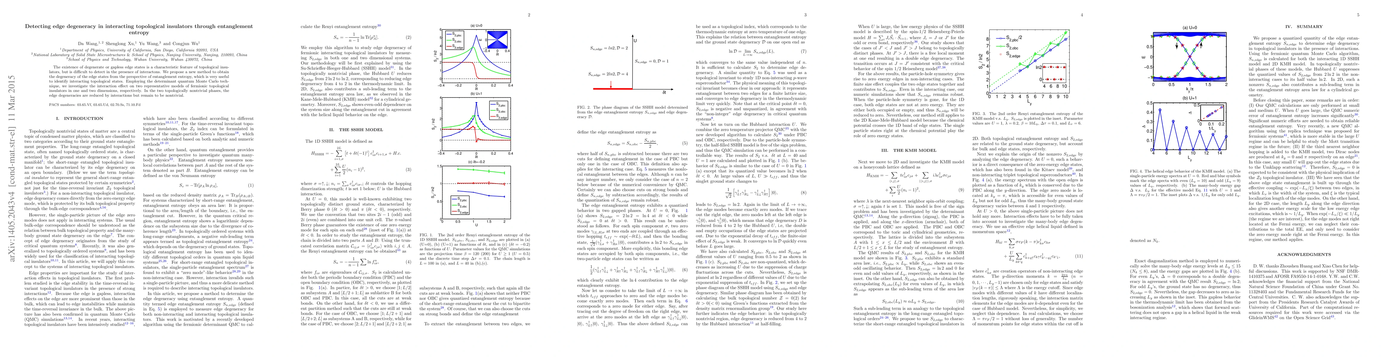 This paper proposes a method to detect edge degeneracy in interacting topological insulators via entanglement entropy, demonstrating that while interactions reduce edge degeneracies, they still retain nontrivial topological characteristics. The study uses determinant quantum Monte Carlo to analyze fermionic topological insulators in one and two dimensions.