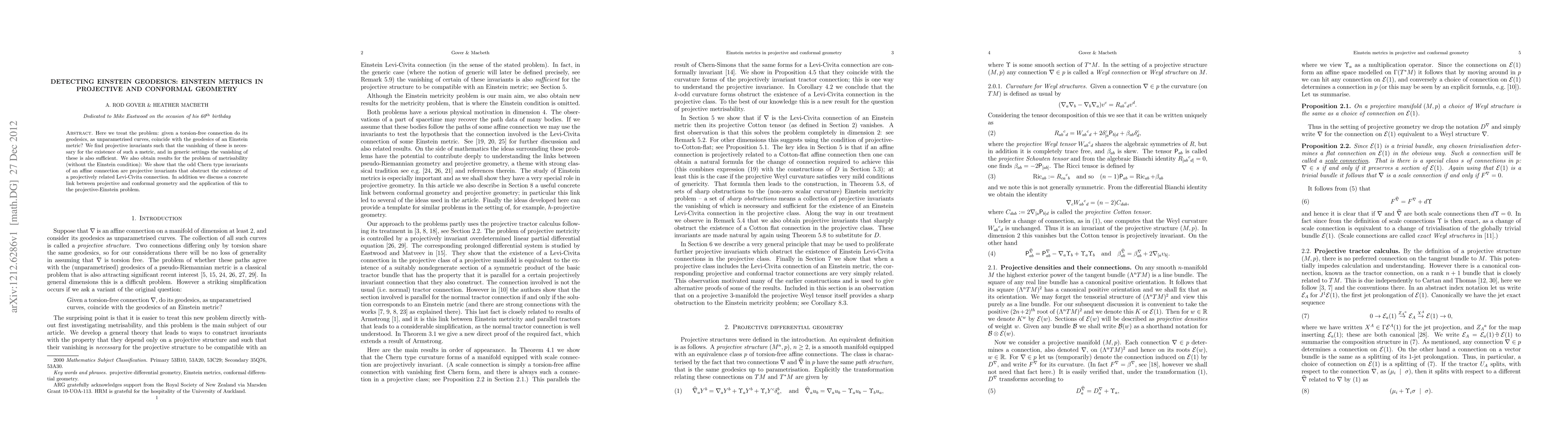 This paper investigates whether geodesics from a torsion-free connection can coincide with those of an Einstein metric, identifying projective invariants necessary for such a metric's existence. It also explores the metrisability problem, revealing that odd Chern type invariants obstruct the existence of a projectively related Levi-Civita connection.