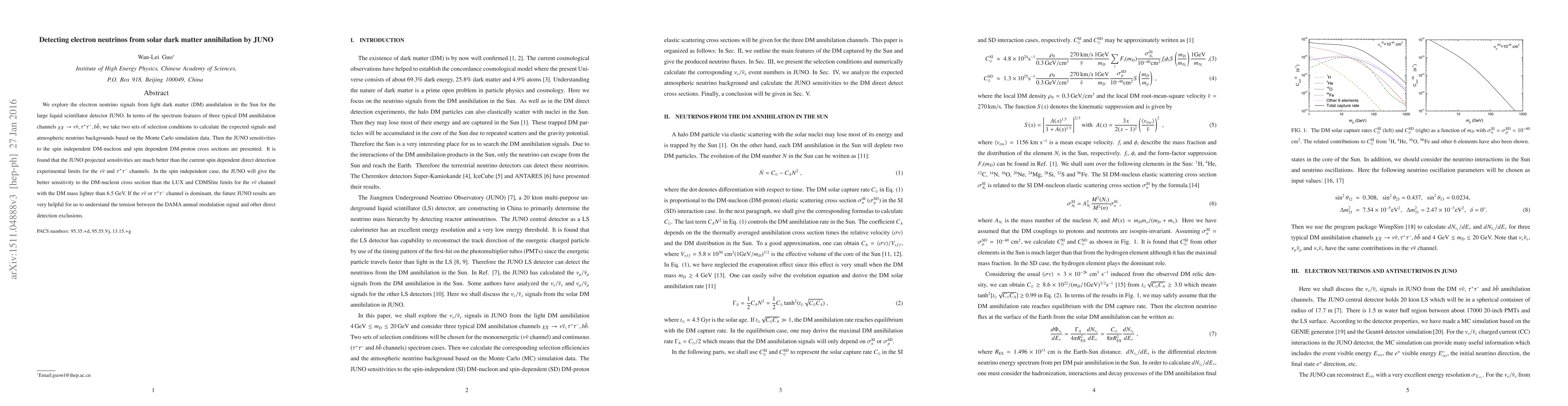 This paper investigates electron neutrino signals from solar dark matter annihilation using the JUNO detector, finding that JUNO's projected sensitivities surpass current experimental limits for certain annihilation channels. JUNO is expected to significantly improve the detection of dark matter-nucleon cross sections, particularly for lighter dark matter masses.
