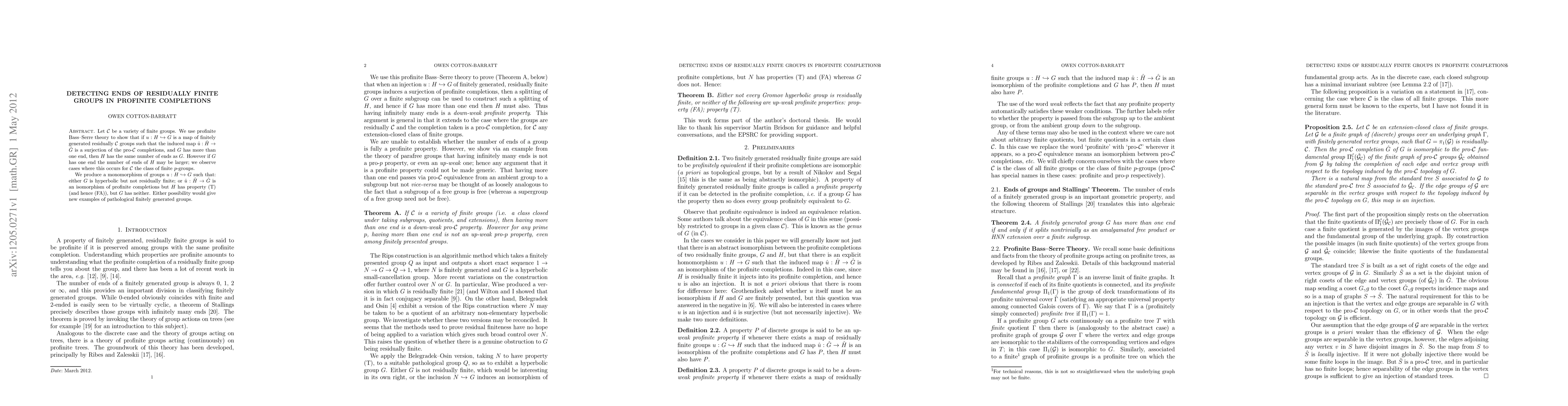 This paper explores the detection of ends in residually finite groups through their profinite completions, demonstrating that if a finitely generated residually $\C$ group $H$ maps surjectively onto another such group $G$ via $\hat{u}$, then $H$ retains the same number of ends as $G$ unless $G$ has one end. It also presents a monomorphism illustrating groups with contrasting properties, potentially leading to new examples of anomalous finitely generated groups.