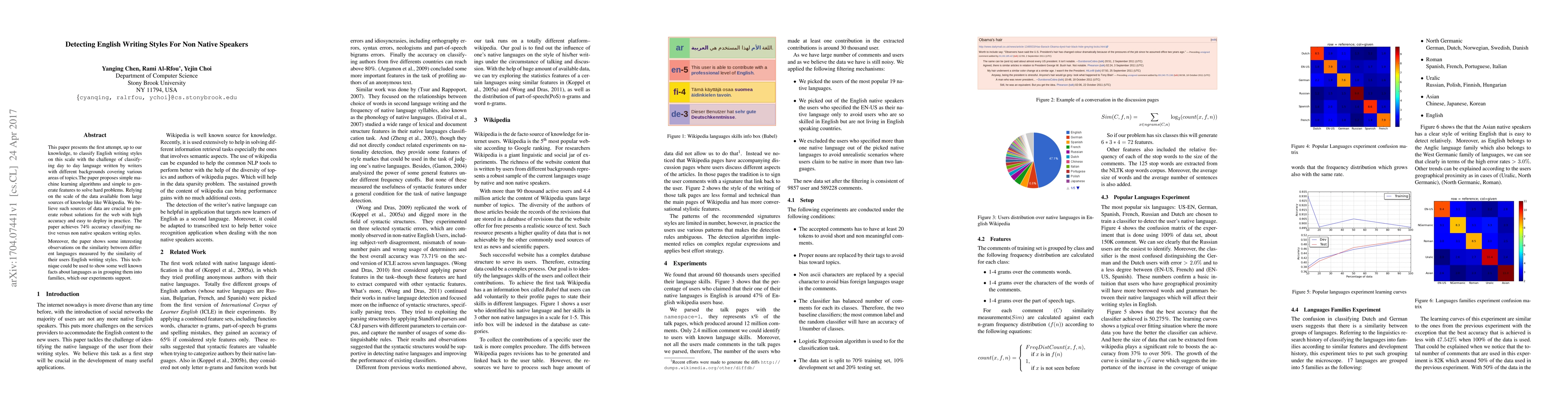 This paper presents the first attempt, up to our knowledge, to classify English writing styles on this scale with the challenge of classifying day to day language written by writers with different backgrounds covering various areas of topics.The paper proposes simple machine learning algorithms and simple to generate features to solve hard problems. Relying on the scale of the data available from large sources of knowledge like Wikipedia. We believe such sources of data are crucial to generate robust solutions for the web with high accuracy and easy to deploy in practice. The paper achieves 74\% accuracy classifying native versus non native speakers writing styles. Moreover, the paper shows some interesting observations on the similarity between different languages measured by the similarity of their users English writing styles. This technique could be used to show some well known facts about languages as in grouping them into families, which our experiments support.
