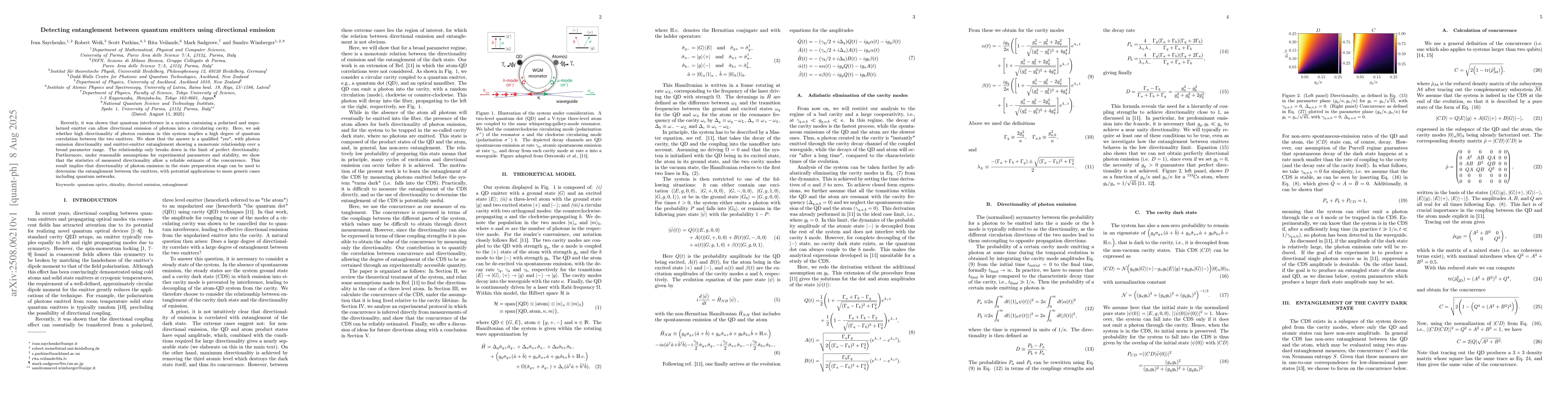 The paper presents an analytical framework for relating the directionality of photon emission to the entanglement of cavity dark states, offering a method to quantify entanglement in quantum systems involving QDs and atoms coupled to cavities.