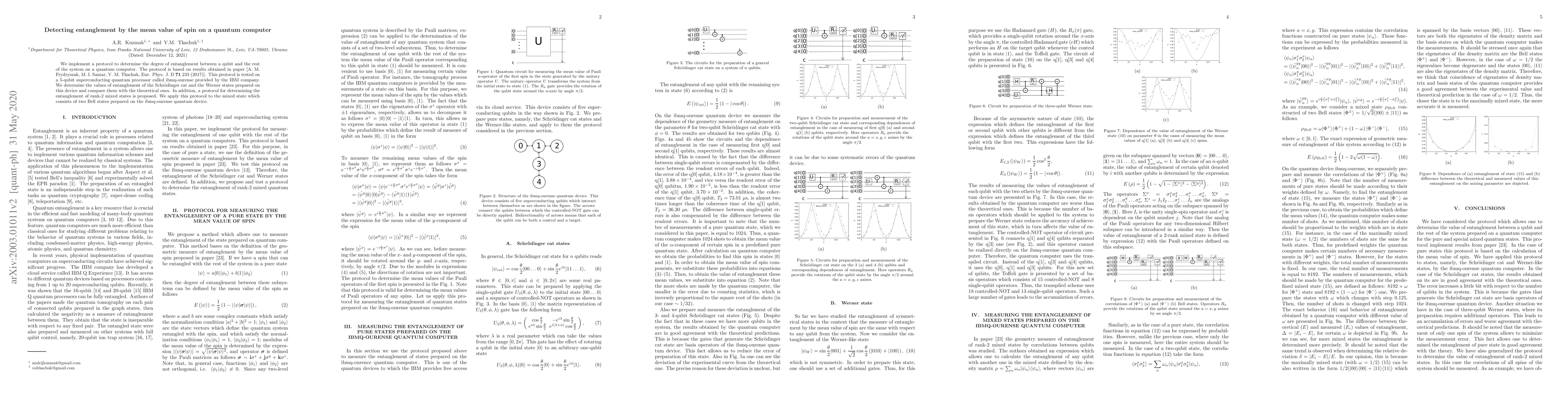 This paper proposes a protocol for measuring entanglement on a quantum computer using the mean value of spin, tested on IBM's 5-qubit superconducting processor. The protocol is applied to Schrödinger cat and Werner states, comparing results with theoretical values, and a new method for rank-2 mixed states is introduced and tested on a mixed state of two Bell states.