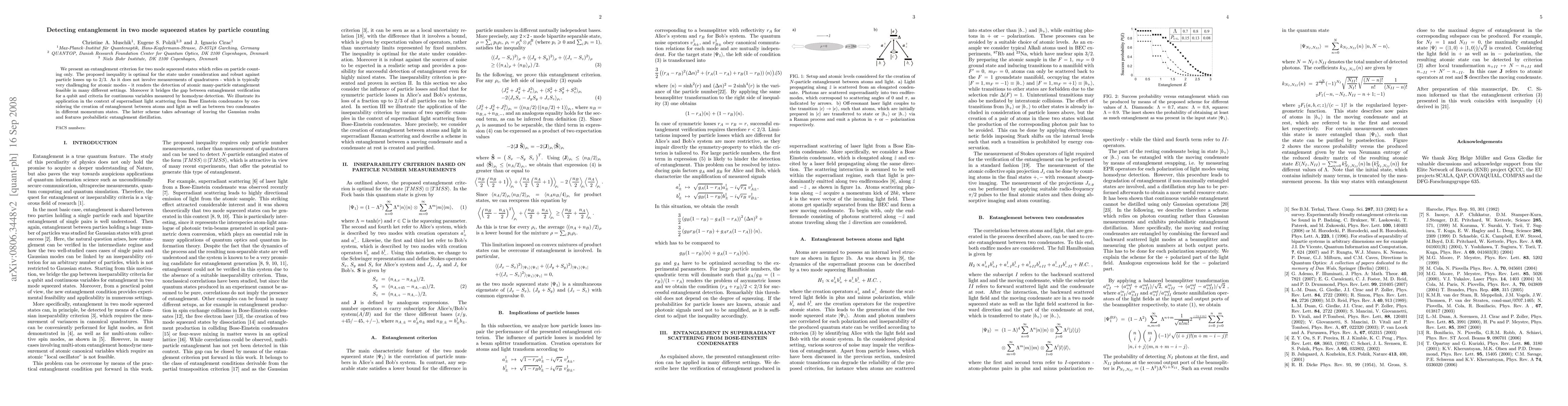 This paper proposes an entanglement criterion for two-mode squeezed states using particle counting, which is optimal and robust against losses. It facilitates the detection of atomic many-particle entanglement in various settings and bridges criteria for qubits and continuous variables.