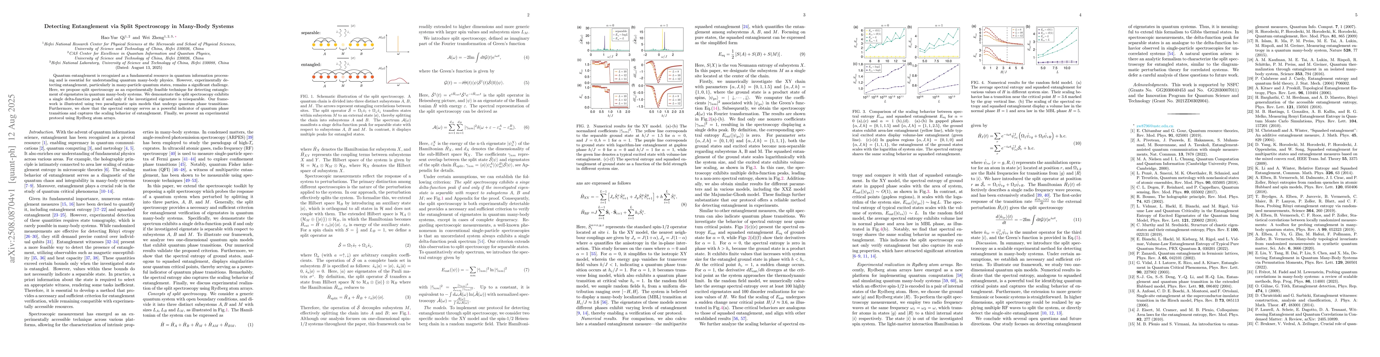 Quantum entanglement is recognized as a fundamental resource in quantum information processing and is essential for understanding quantum many-body physics. However, experimentally detecting entanglement, particularly in many-particle quantum states, remains a significant challenge. Here, we propose split spectroscopy as an experimentally feasible technique for detecting entanglement of eigenstates in quantum many-body systems. We demonstrate the split spectroscopy exhibits a single delta-function peak if and only if the investigated eigenstate is triseparable. Our framework is illustrated using two paradigmatic spin models that undergo quantum phase transitions. Furthermore, we show that the spectral entropy serves as a powerful indicator of quantum phase transitions and captures the scaling behavior of entanglement. Finally, we present an experimental protocol using Rydberg atom arrays.