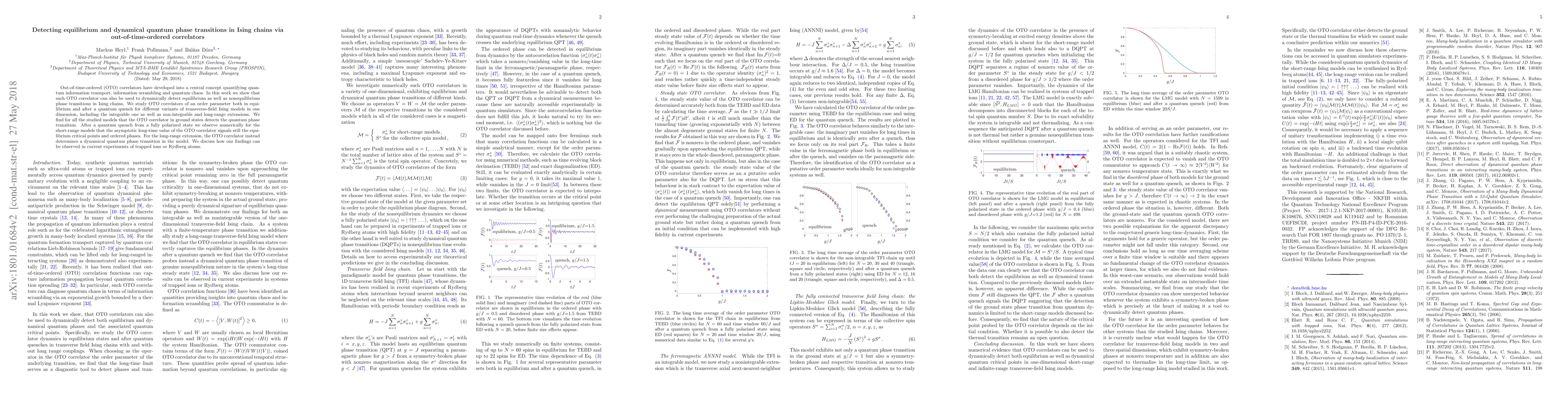 This paper demonstrates that out-of-time-ordered correlators (OTO) can detect both equilibrium and dynamical quantum phase transitions in Ising chains, showing their effectiveness in identifying critical points and ordered phases in both integrable and non-integrable models. The study highlights the potential for observing these transitions in current quantum experiments using trapped ions or Rydberg atoms.