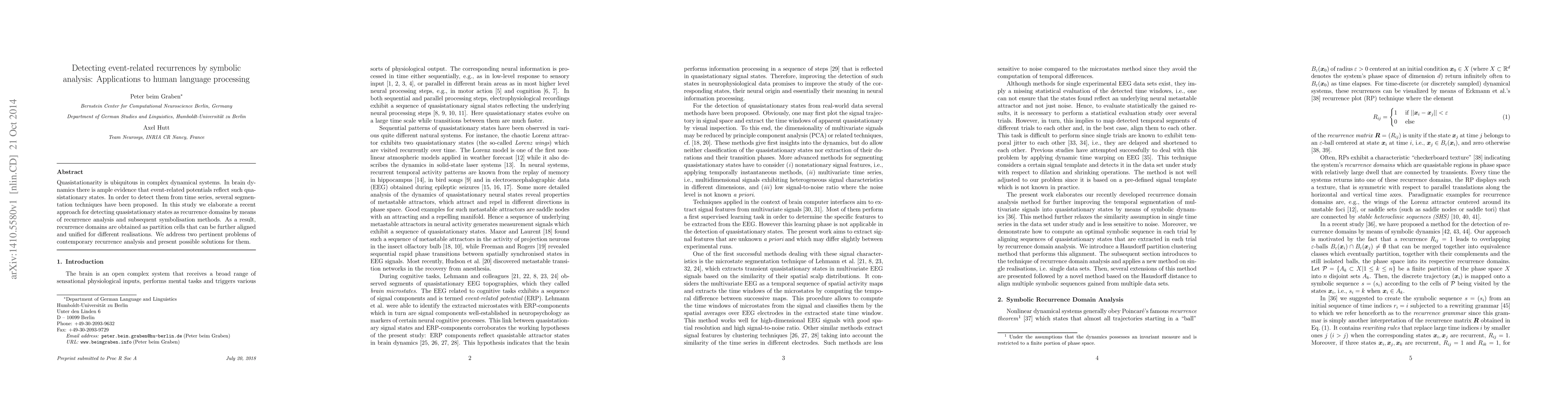 This paper proposes a method for detecting quasistationary states in brain dynamics using recurrence analysis and symbolic methods to segment event-related potentials from time series. It addresses challenges in contemporary recurrence analysis and provides solutions for improved detection of event-related recurrences.