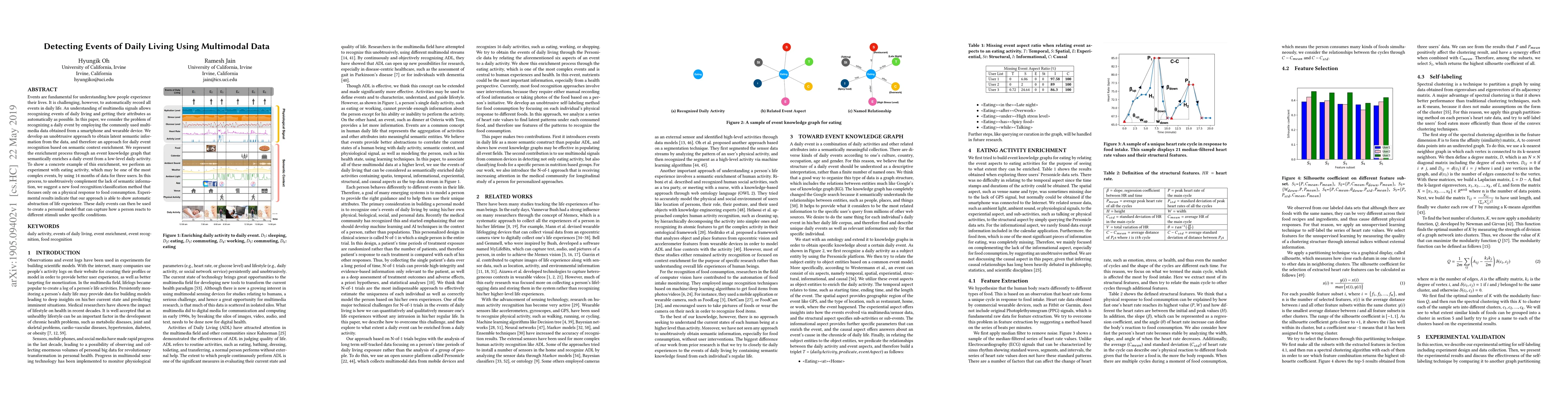 This research presents an approach to automatically recognize daily events using multimedia data from smartphones and wearables. By employing semantic context enrichment, it creates an event knowledge graph to represent the enrichment process, focusing on a food recognition method for complex events like eating. Experiments over 14 months of data for three users demonstrate the method's effectiveness in capturing life experiences and creating personal models of individual reactions to stimuli.