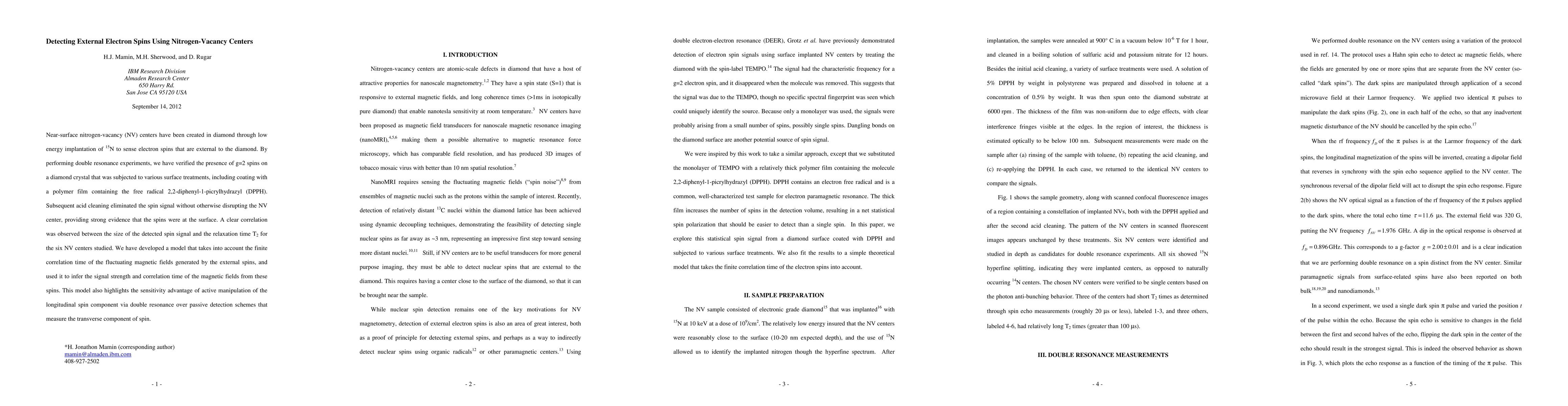 Near-surface nitrogen-vacancy (NV) centers have been created in diamond through low energy implantation of 15N to sense electron spins that are external to the diamond. By performing double resonance experiments, we have verified the presence of g=2 spins on a diamond crystal that was subjected to various surface treatments, including coating with a polymer film containing the free radical 2,2-diphenyl-1-picrylhydrazyl (DPPH). Subsequent acid cleaning eliminated the spin signal without otherwise disrupting the NV center, providing strong evidence that the spins were at the surface. A clear correlation was observed between the size of the detected spin signal and the relaxation time T2 for the six NV centers studied. We have developed a model that takes into account the finite correlation time of the fluctuating magnetic fields generated by the external spins, and used it to infer the signal strength and correlation time of the magnetic fields from these spins. This model also highlights the sensitivity advantage of active manipulation of the longitudinal spin component via double resonance over passive detection schemes that measure the transverse component of spin.