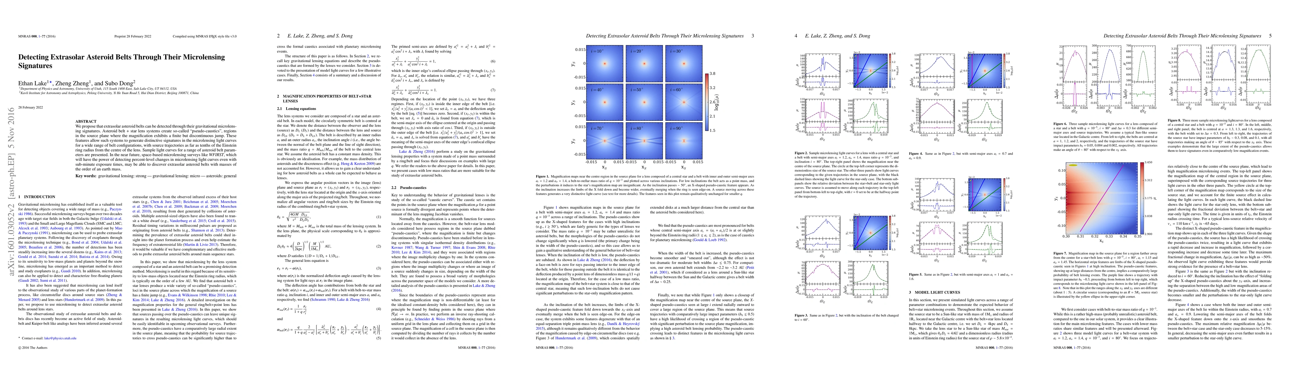 This paper proposes detecting extrasolar asteroid belts via their gravitational microlensing signatures, which create distinctive "pseudo-caustics" in microlensing light curves. Future space-based surveys like WFIRST may identify these belts, even those with Earth-mass sizes, through percent-level changes in light curves.