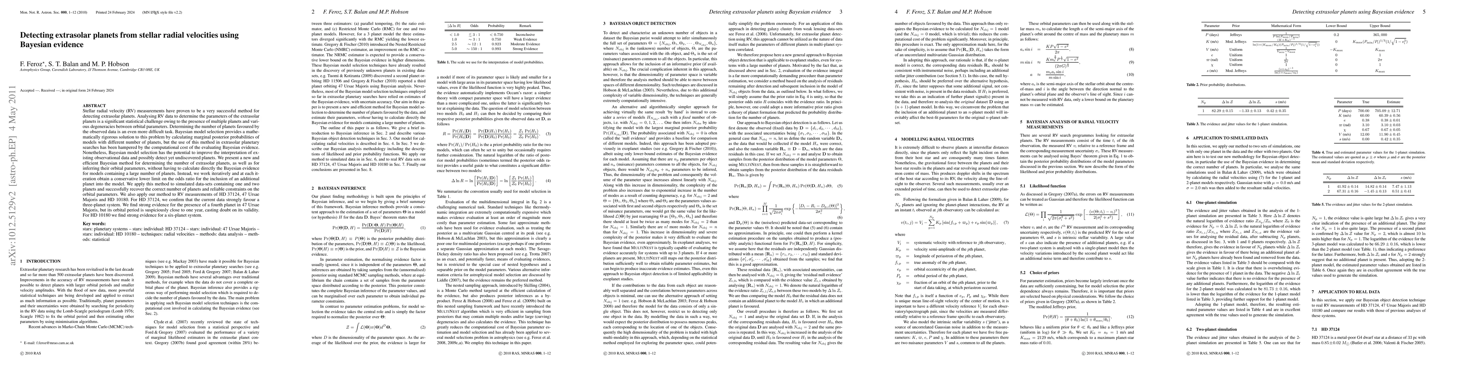 This paper presents a new Bayesian method to efficiently detect extrasolar planets using stellar radial velocity data, overcoming the computational challenges of traditional Bayesian model selection. The method iteratively estimates the odds of additional planets without directly calculating Bayesian evidence, successfully identifying the correct number of planets in simulations and real data, including a three-planet system in HD 37124, a potential fourth planet in 47 Ursae Majoris, and a six-planet system in HD 10180.
