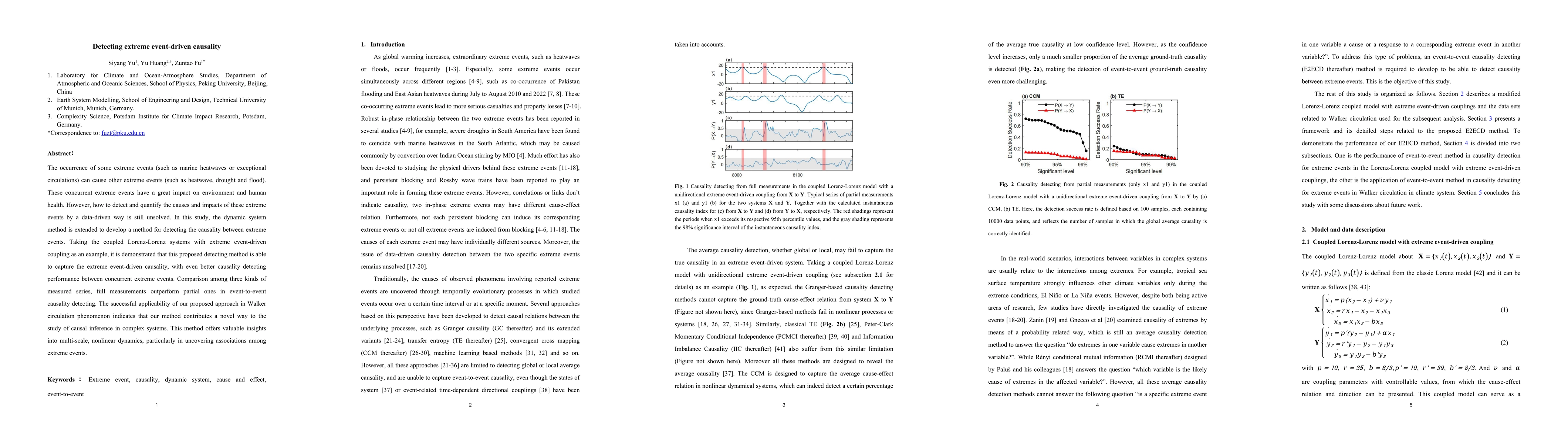 The occurrence of some extreme events (such as marine heatwaves or exceptional circulations) can cause other extreme events (such as heatwave, drought and flood). These concurrent extreme events have a great impact on environment and human health. However, how to detect and quantify the causes and impacts of these extreme events by a data-driven way is still unsolved. In this study, the dynamic system method is extended to develop a method for detecting the causality between extreme events. Taking the coupled Lorenz-Lorenz systems with extreme event-driven coupling as an example, it is demonstrated that this proposed detecting method is able to capture the extreme event-driven causality, with even better causality detecting performance between concurrent extreme events. Comparison among three kinds of measured series, full measurements outperform partial ones in event-to-event causality detecting. The successful applicability of our proposed approach in Walker circulation phenomenon indicates that our method contributes a novel way to the study of causal inference in complex systems. This method offers valuable insights into multi-scale, nonlinear dynamics, particularly in uncovering associations among extreme events.
