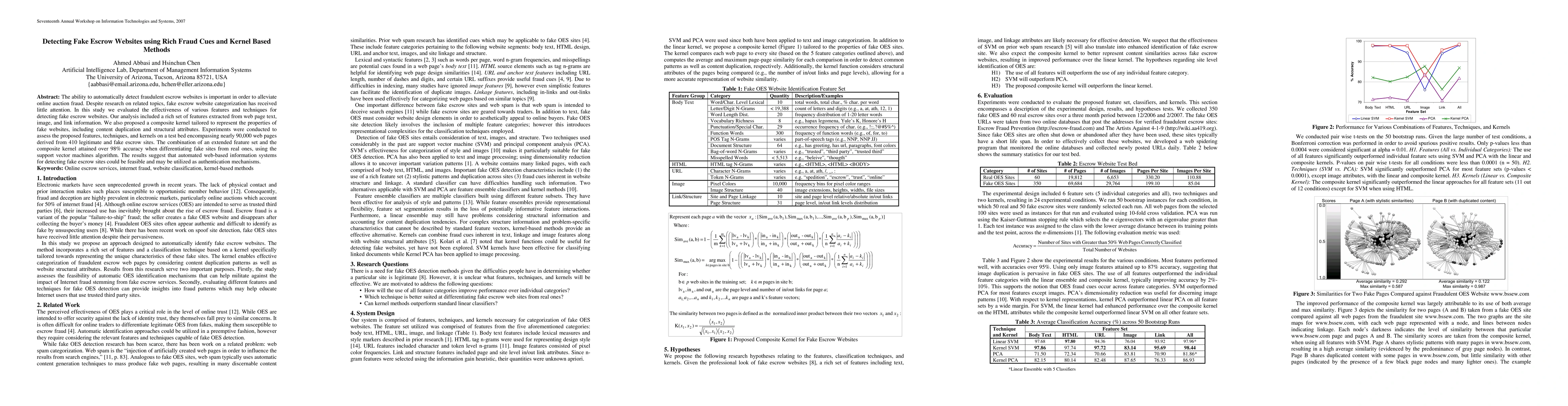 This study evaluates the effectiveness of various features and techniques for detecting fraudulent escrow websites, employing a rich set of features and a composite kernel method. The proposed approach achieved over 98% accuracy in distinguishing fake from legitimate sites using support vector machines, suggesting the feasibility of automated detection systems.