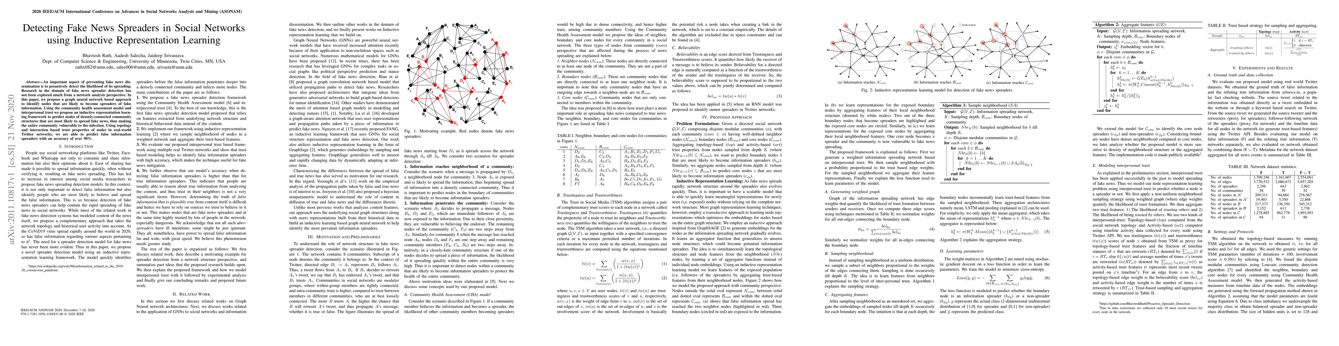 An important aspect of preventing fake news dissemination is to proactively detect the likelihood of its spreading. Research in the domain of fake news spreader detection has not been explored much from a network analysis perspective. In this paper, we propose a graph neural network based approach to identify nodes that are likely to become spreaders of false information. Using the community health assessment model and interpersonal trust we propose an inductive representation learning framework to predict nodes of densely-connected community structures that are most likely to spread fake news, thus making the entire community vulnerable to the infection. Using topology and interaction based trust properties of nodes in real-world Twitter networks, we are able to predict false information spreaders with an accuracy of over 90%.