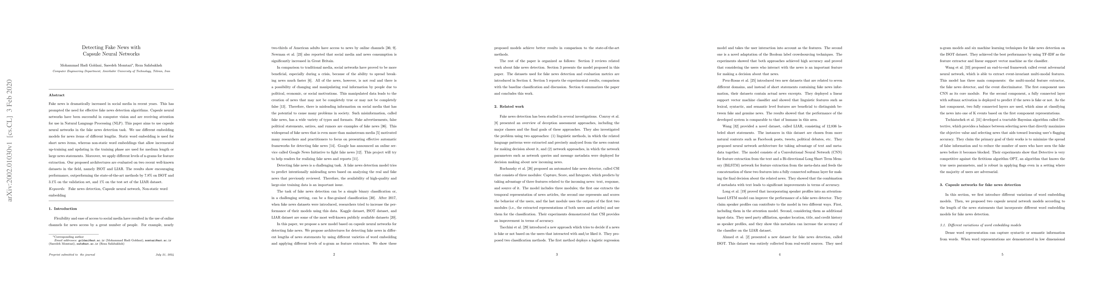 This paper explores the use of capsule neural networks for detecting fake news in social media, employing different embedding models and feature extraction techniques. Experimental results show improved performance over existing methods on the ISOT and LIAR datasets.