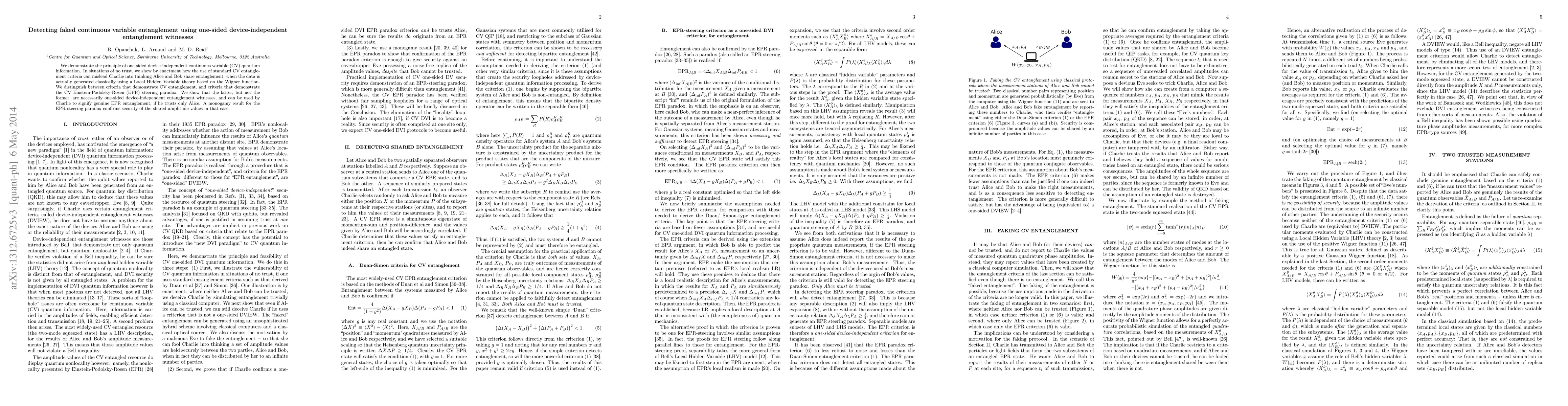 We demonstrate the principle of one-sided device-independent continuous variable (CV) quantum information. In situations of no trust, we show by enactment how the use of standard CV entanglement criteria can mislead Charlie into thinking Alice and Bob share entanglement, when the data is actually generated classically using a Local Hidden Variable theory based on the Wigner function. We distinguish between criteria that demonstrate CV entanglement, and criteria that demonstrate the CV Einstein-Podolsky-Rosen (EPR) steering paradox. We show that the latter, but not the former, are necessarily one-sided device-independent entanglement witnesses, and can be used by Charlie to signify genuine EPR entanglement, if he trusts only Alice. A monogamy result for the EPR steering paradox confirms security of the shared amplitude values in that case.