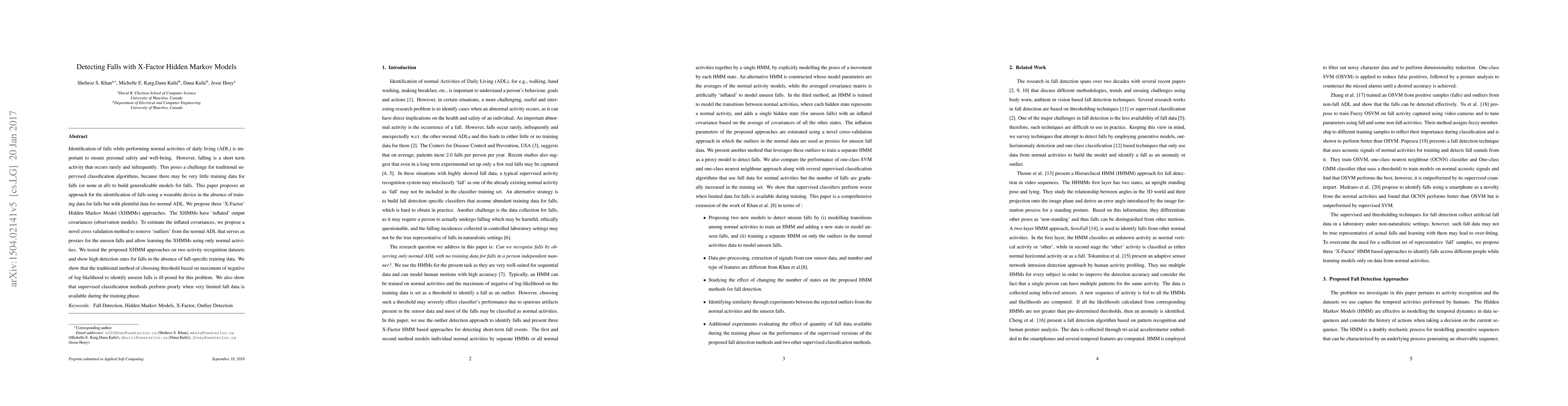 This paper proposes X-Factor Hidden Markov Models (XHMMs) to detect falls using wearable devices without fall-specific training data, relying on normal activities. The XHMMs utilize inflated output covariances and a novel cross-validation method to identify falls, demonstrating high detection rates on two activity datasets.