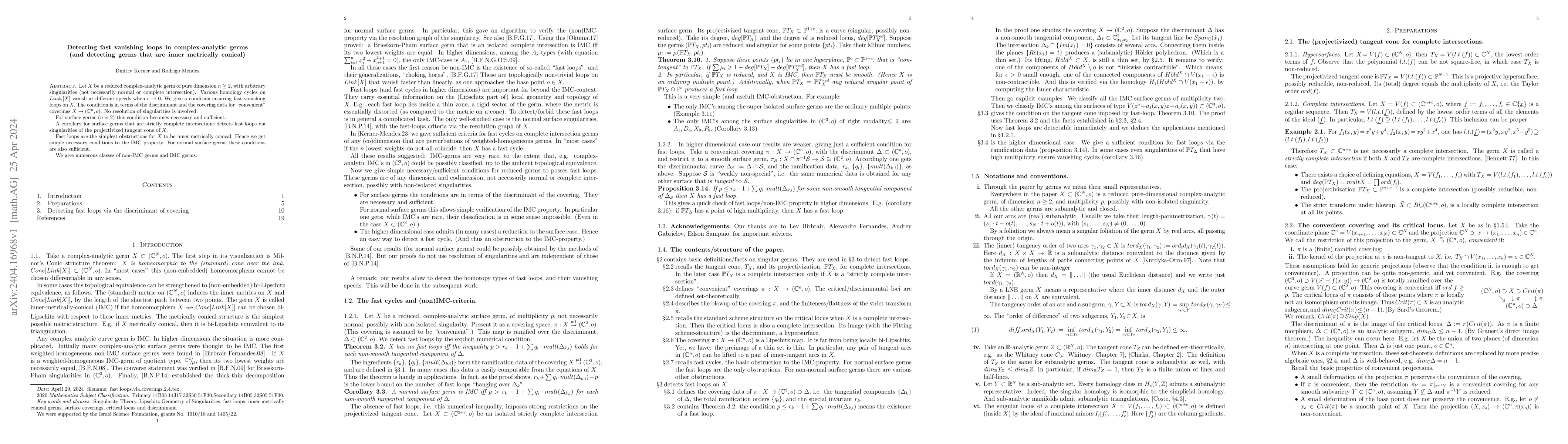 Let X be a reduced complex-analytic germ of pure dimension n\ge2, with arbitrary singularities (not necessarily normal or complete intersection). Various homology cycles on Link_\ep[X] vanish at different speeds when \ep\to0. We give a condition ensuring fast vanishing loops on X. The condition is in terms of the discriminant and the covering data for "convenient" coverings X\to (C^n,o). No resolution of singularities is involved. For surface germs (n=2) this condition becomes necessary and sufficient. A corollary for surface germs that are strictly complete intersections detects fast loops via singularities of the projectivized tangent cone of X. Fast loops are the simplest obstructions for X to be inner metrically conical. Hence we get simple necessary conditions to the IMC property. For normal surface germs these conditions are also sufficient. We give numerous classes of non-IMC germs and IMC germs.