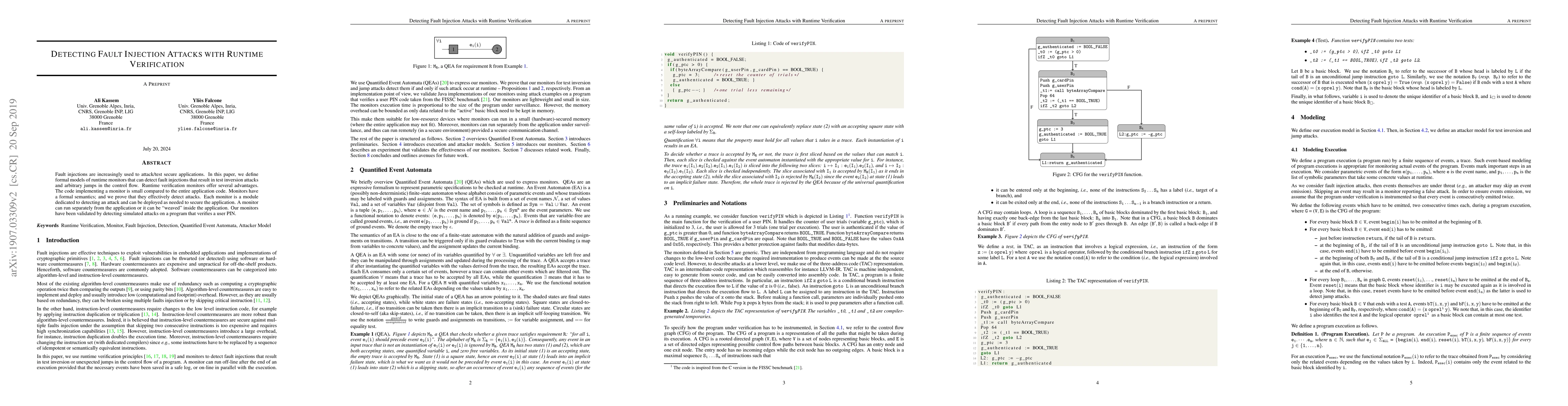 This paper proposes formal models of runtime monitors to detect fault injection attacks, including test inversion and control flow jumps. The monitors are small, have formal semantics, and can be deployed independently or integrated into applications, having been validated through simulated attacks on a PIN verification program.